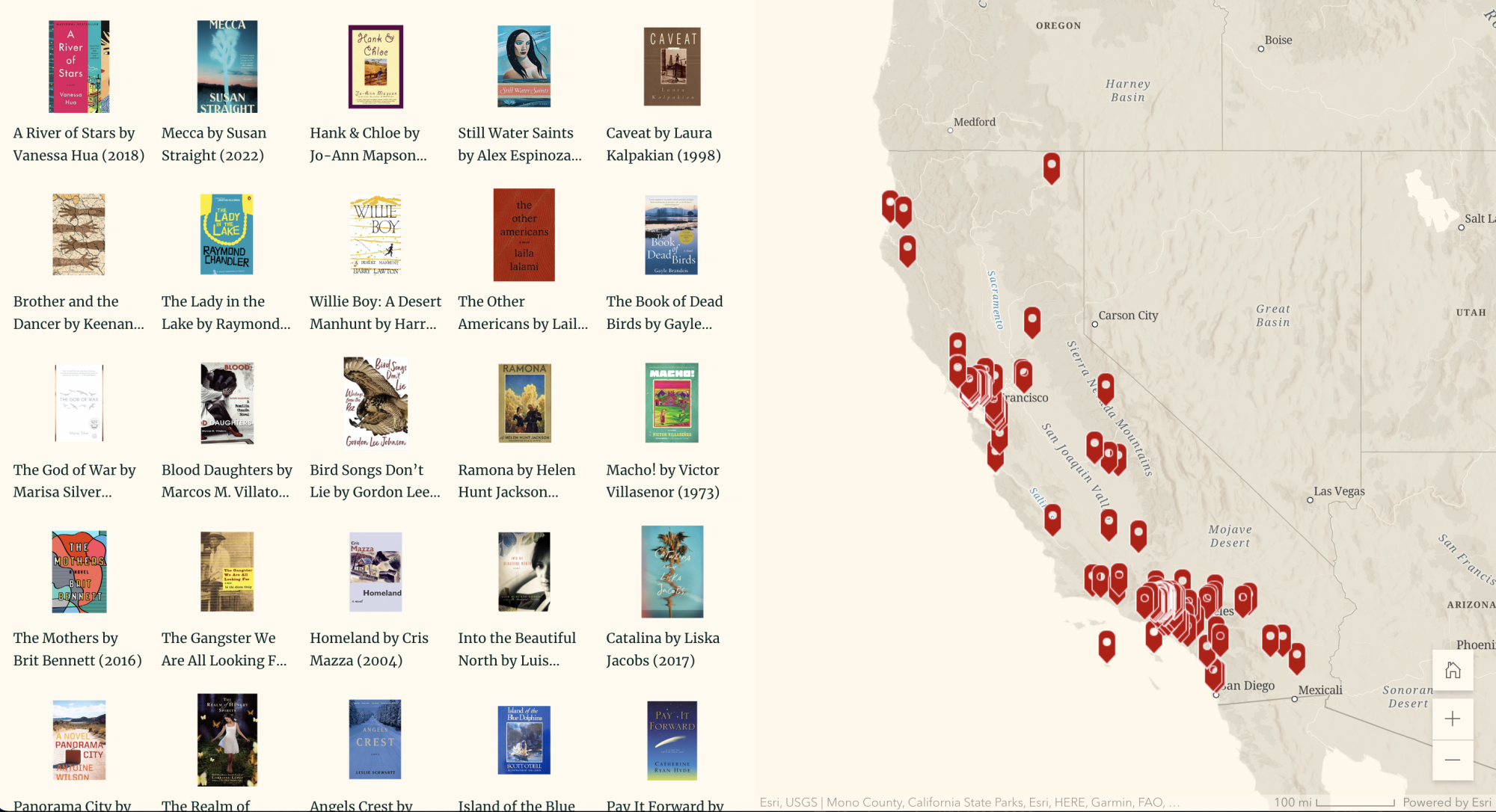 直立的“1001部小说:美国图书馆”截图,显示了Straight标记为加利福尼亚的书籍。来源:Susan Straight/ESRI在地图上,你会发现(还有许多其他作品)贝蒂·史密斯的*《布鲁克林长出一棵树》,出版于1943年,Straight将其标记在布鲁克林威廉斯堡的Lorimer街区,这得益于书中的多个线索。还有迪肖恩·查尔斯·温斯洛(De’Shawn Charles Winslow)于2019年出版的《在西部的磨坊》*,主角经常步行到一个加油站市场,她确定这个地点位于北卡罗来纳州17N号美国高速公路旁。