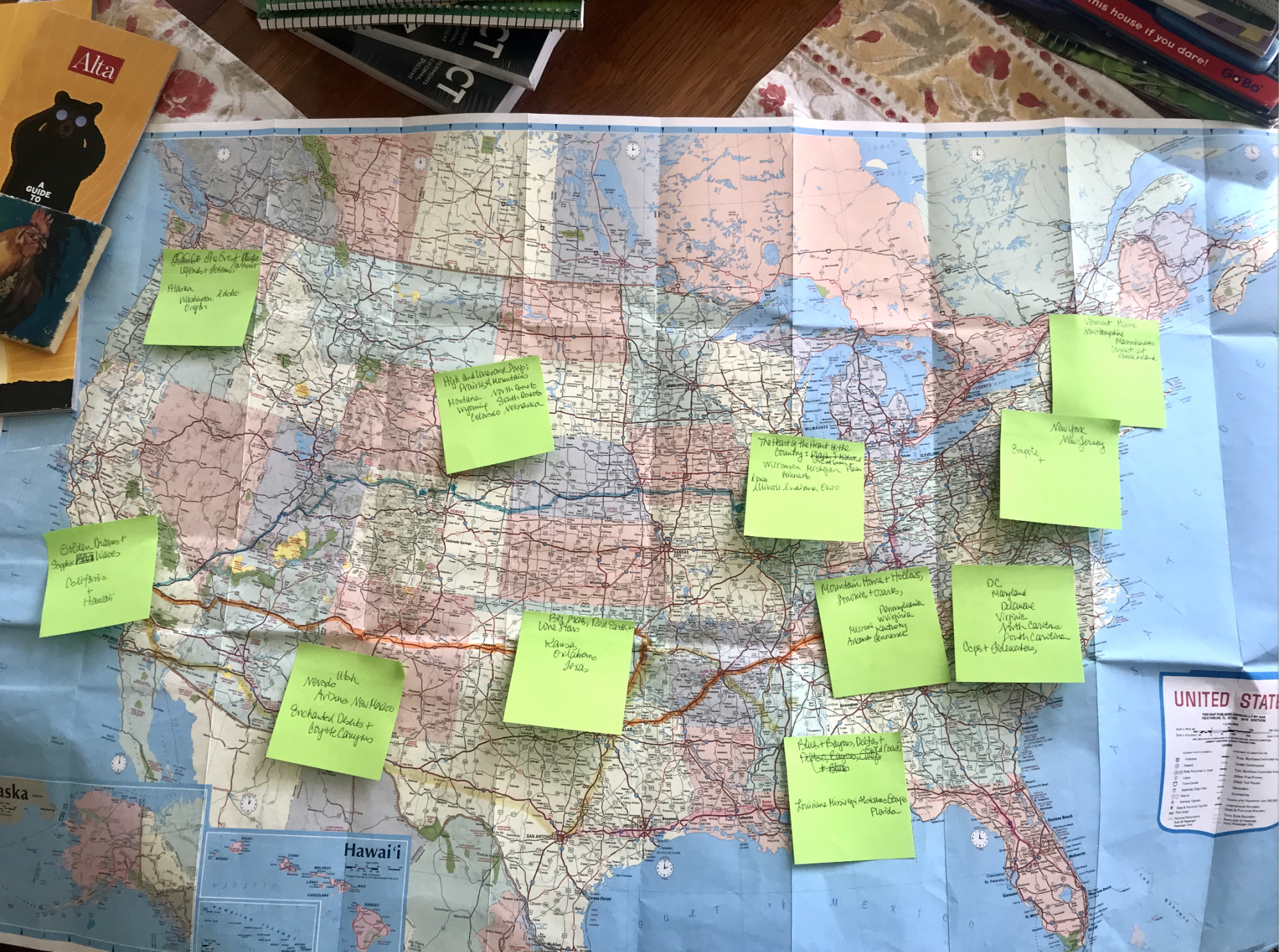 斯特雷特的一张纸质地图被划分为11个文学地区,每个地区都在便利贴上详细说明。图片来源:苏珊·斯特雷特“对于每位我感兴趣的作家,我都试图挑选一本代表一个特定地区的书籍,”斯特雷特说,“所以这位作家可能有20本书,但我选择了一本代表那个确切位置的书。”