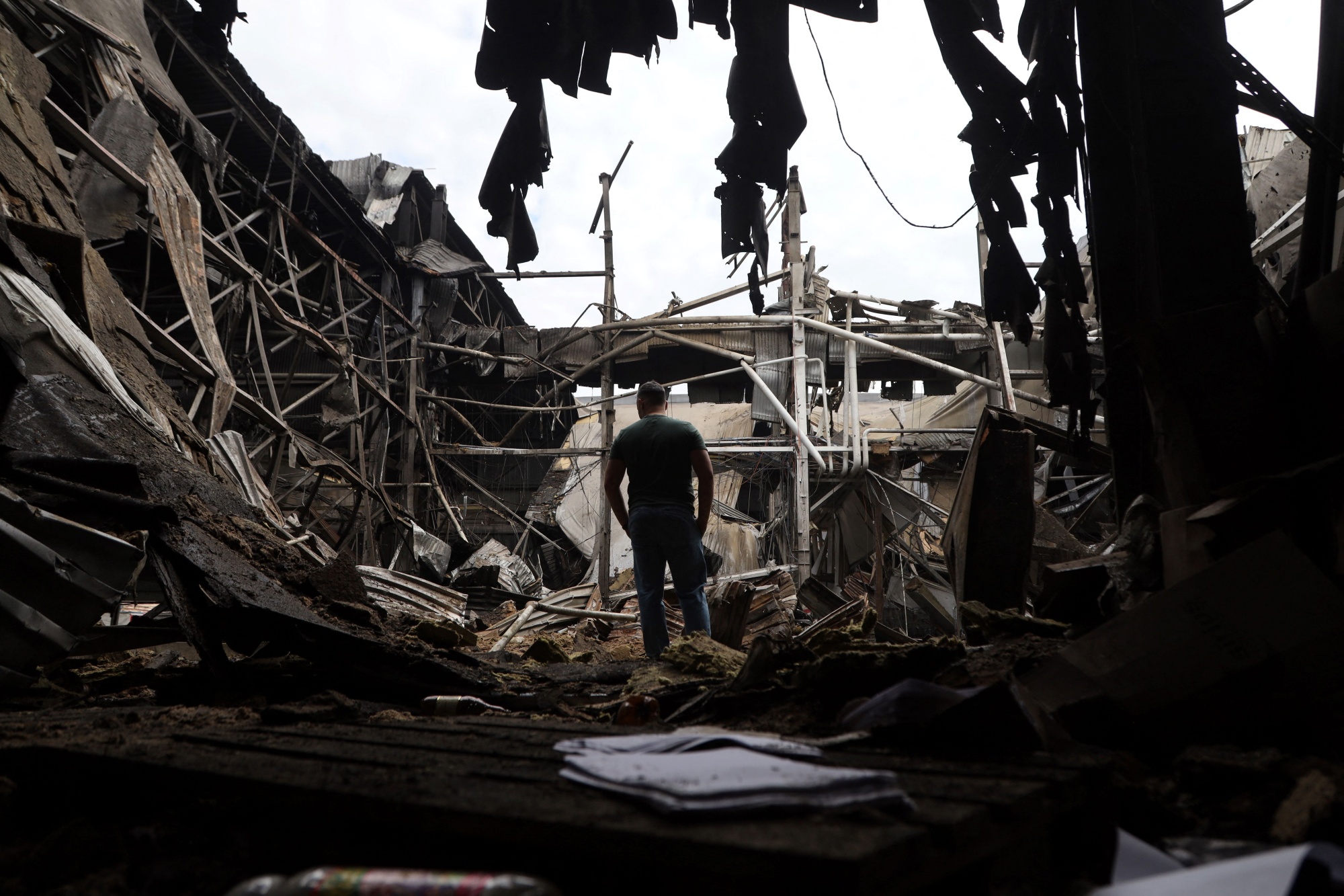 一名男子在乌克兰敖德萨一处遭空袭的仓库废墟中行走。