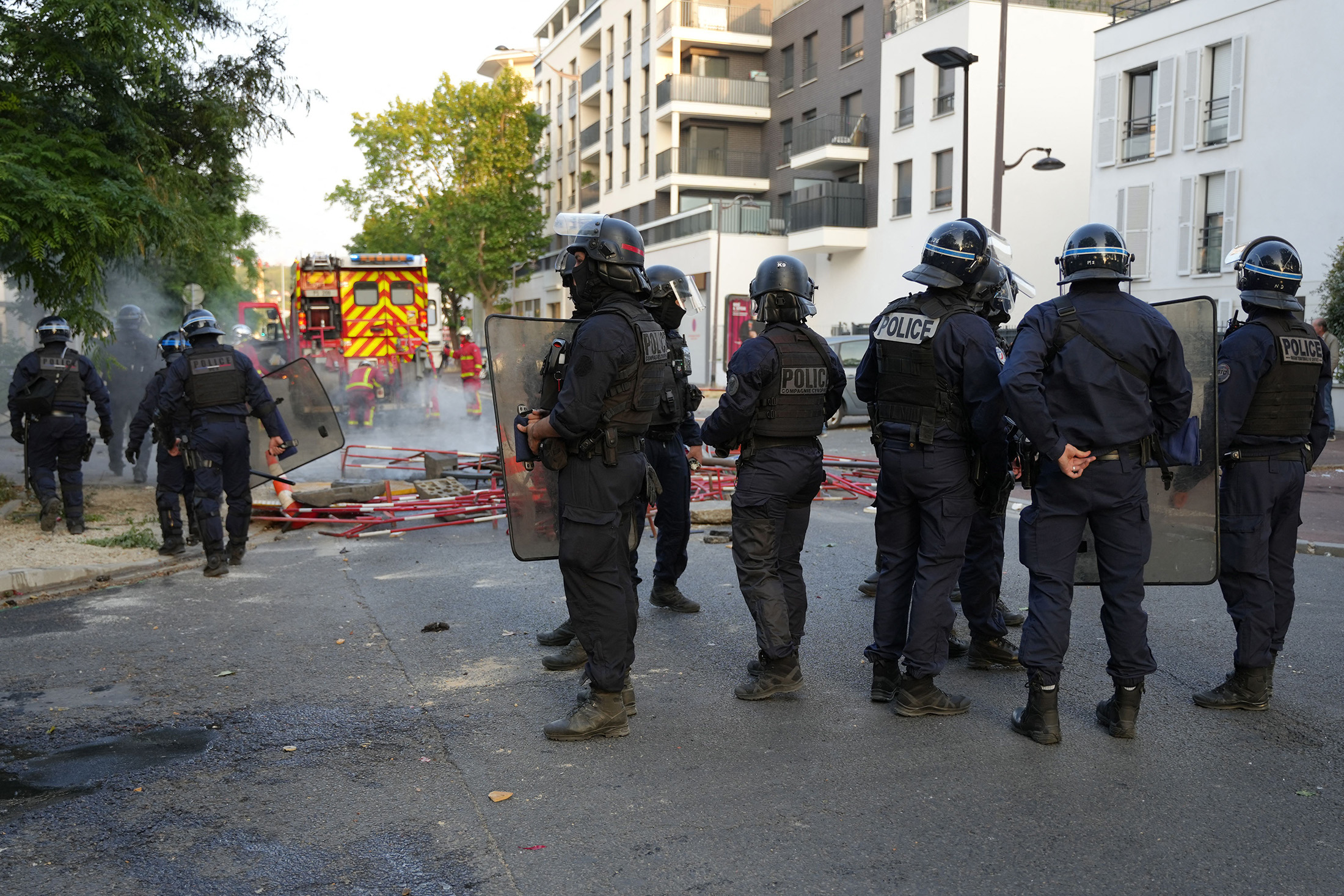 穿着防暴装备的警察在巴黎西部 Nanterre 示威后扑灭火灾时站岗,时间为 6 月 27 日。