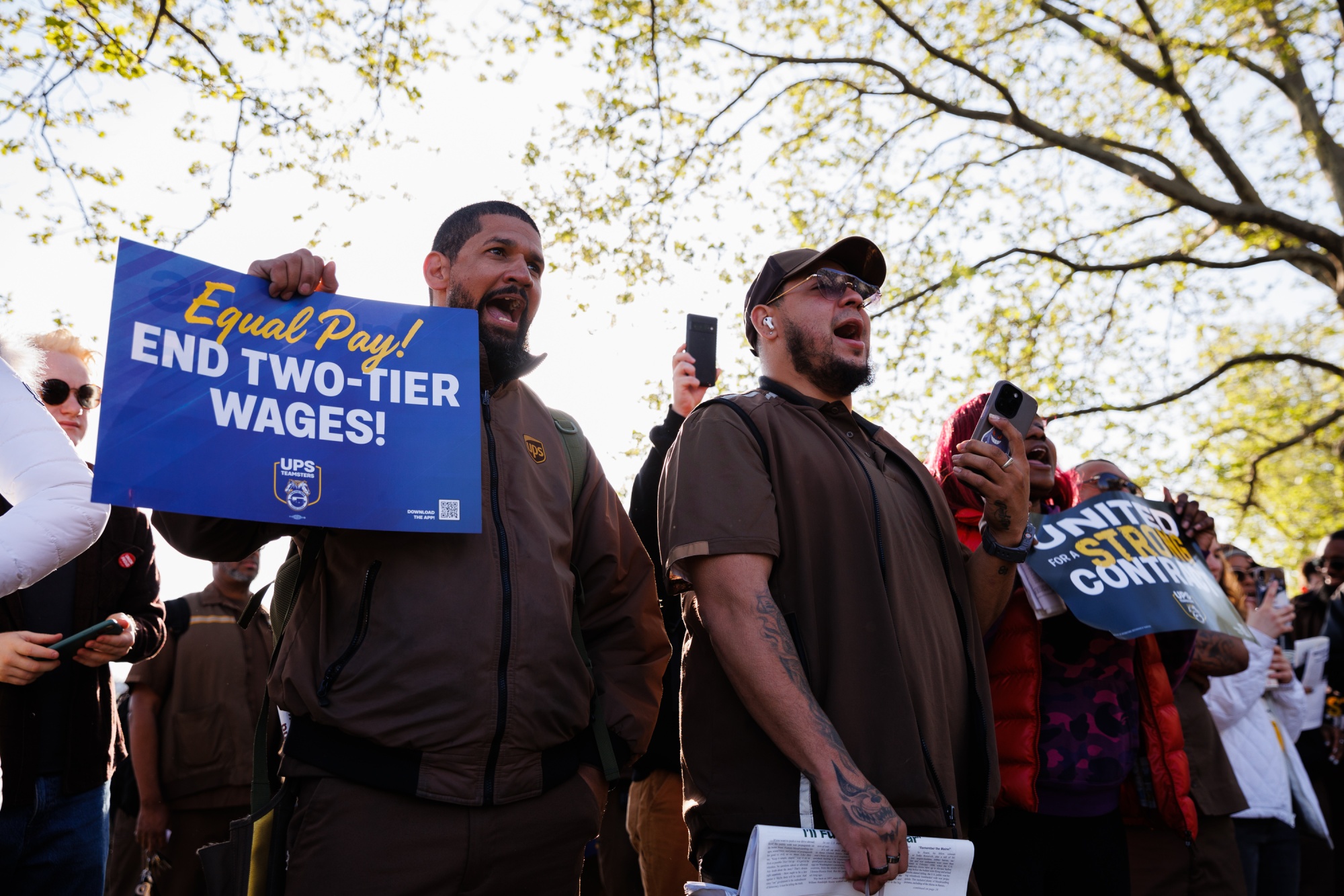 UPS工人和Teamsters成员在四月份在布鲁克林的UPS中心外举行集会。摄影师:Paul Frangipane/Bloomberg### 沉迷于快递