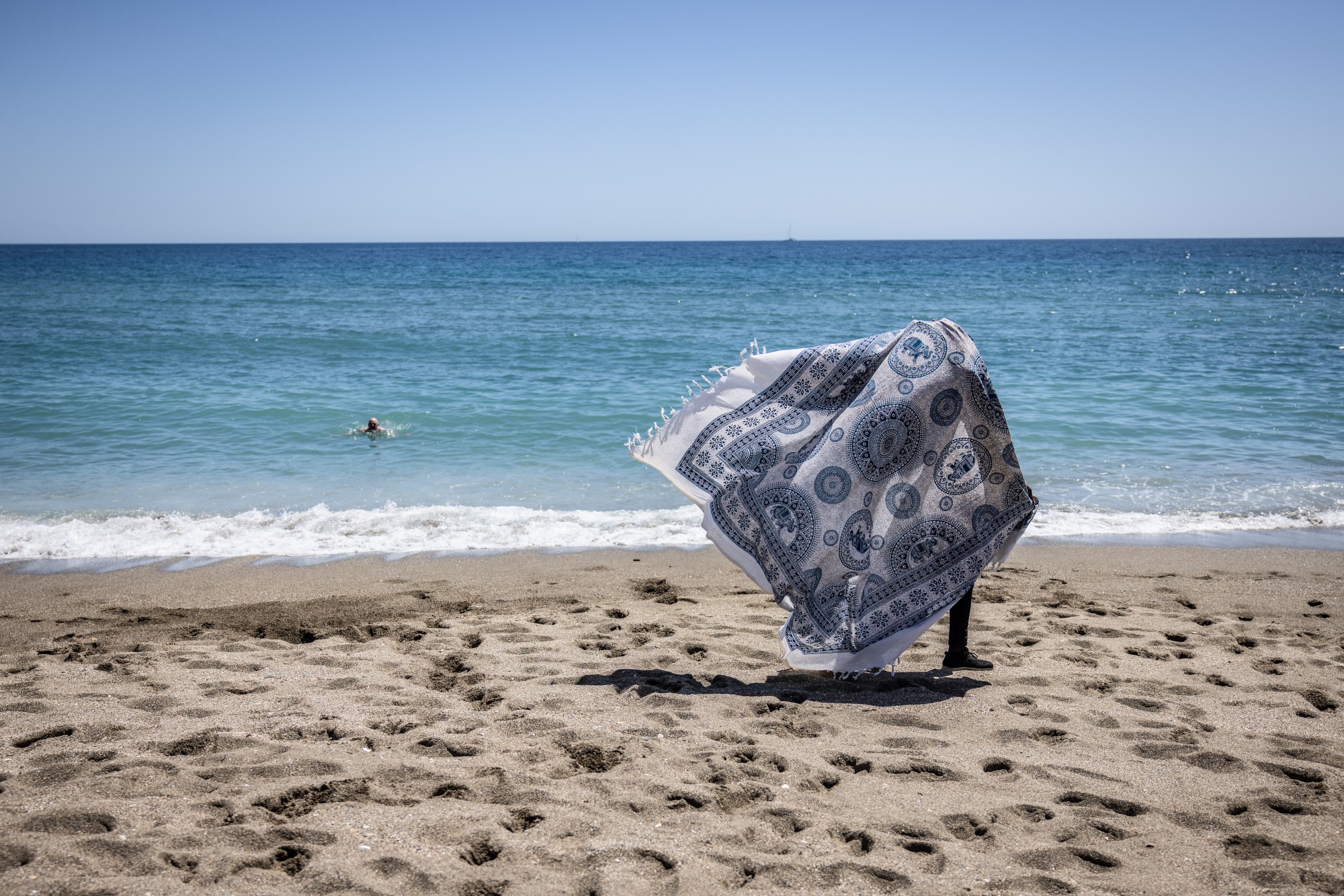 在西班牙马拉加的马拉盖塔海滩上,一位小贩携带着待售的织物。