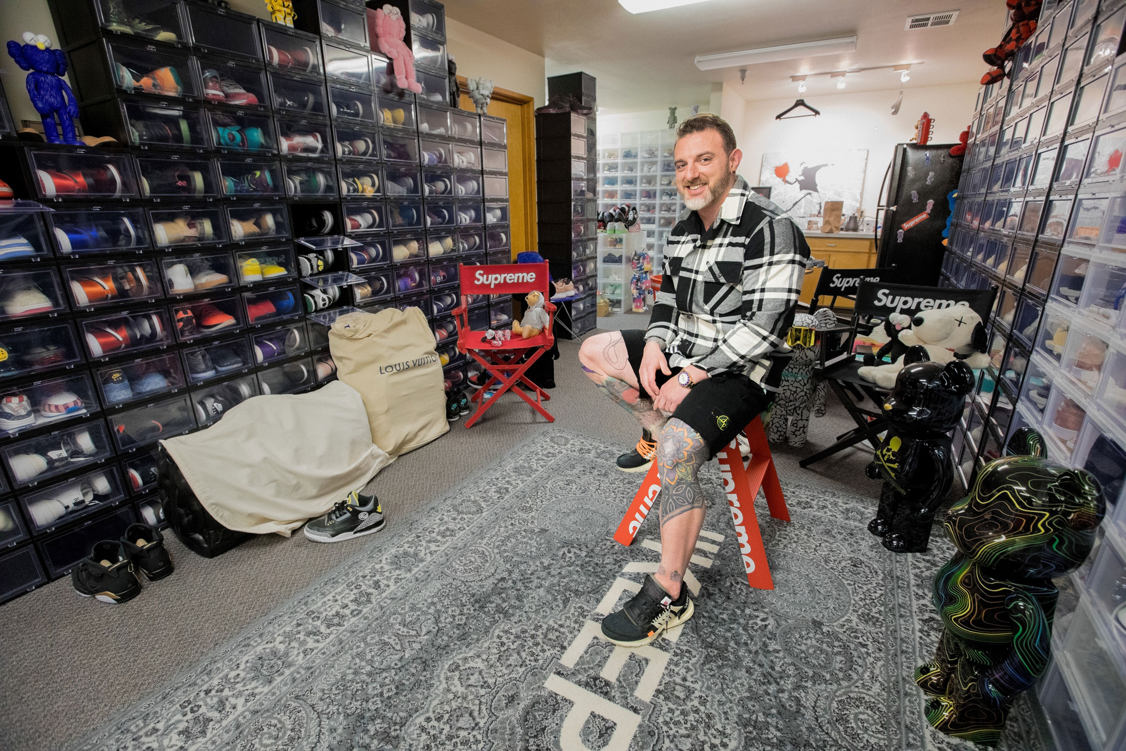 2020年的Zadeh Kicks仓库。摄影师:Todd Cooper/Eugene Weekly他在尤金仓库中经营他的业务,这个仓库与他家族的生物技术公司位于同一建筑物内。这个宽敞的空间逐渐填满了耐克空气乔丹(Nike Air Jordans)、阿迪达斯Yeezys等最热门款式和配色的鞋子。Zadeh Kicks对于该地区来说是一个不太可能的业务,隐藏在一个工业区,对面是一家家具经销商和一家汽车修理店。但尽管只需要几名员工来打包货物,它很快就成为了一个重要的运营中心。Malekzadeh办公的小办公室装饰着海报、街头艺术、他个人的球鞋收藏以及由已故的路易·威登(Louis Vuitton)艺术总监Virgil Abloh设计的限量地毯。