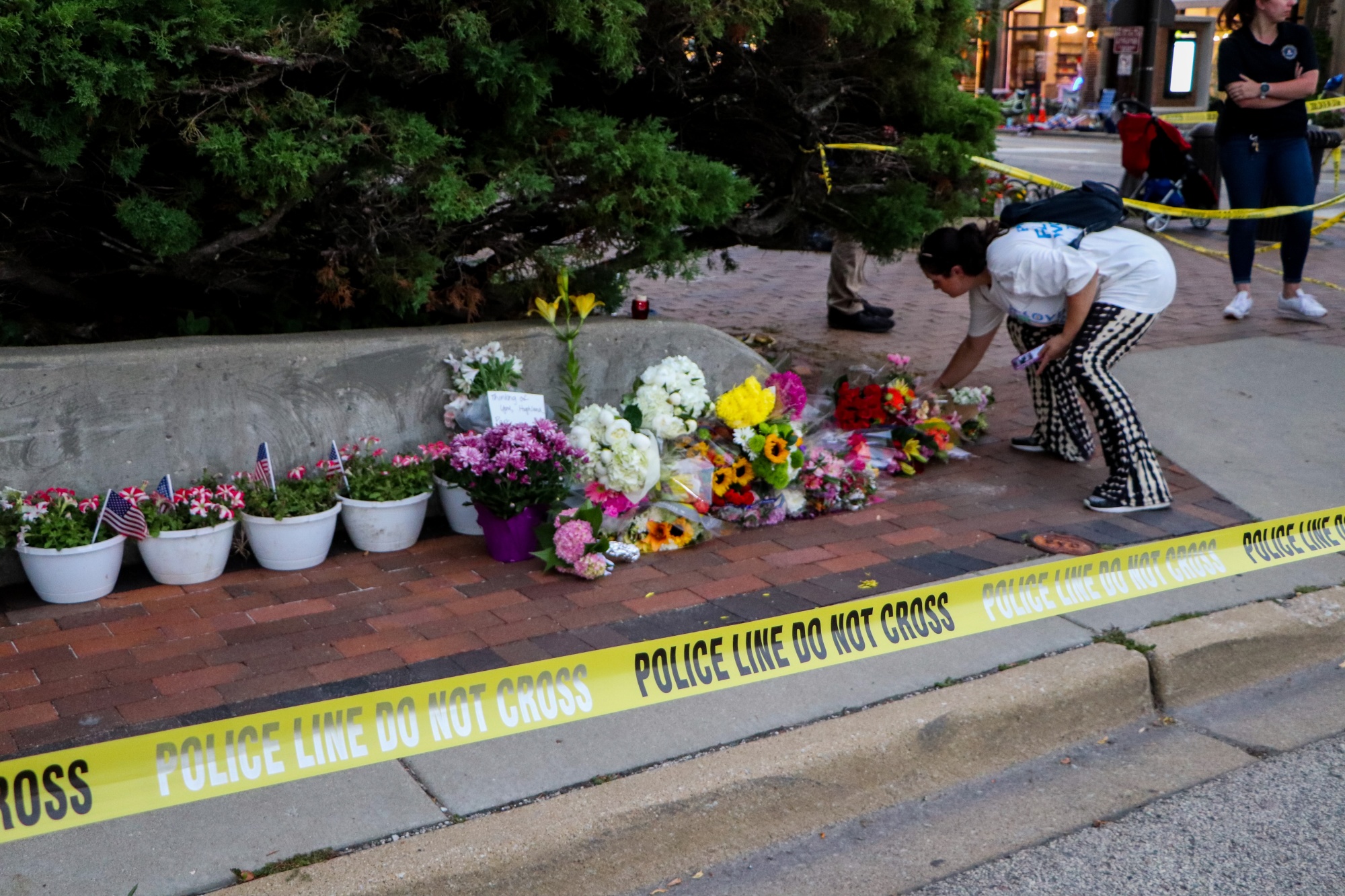 鲜花摆放在伊利诺伊州海兰公园一次大规模枪击事件的临时纪念地上,日期为2022年7月5日。