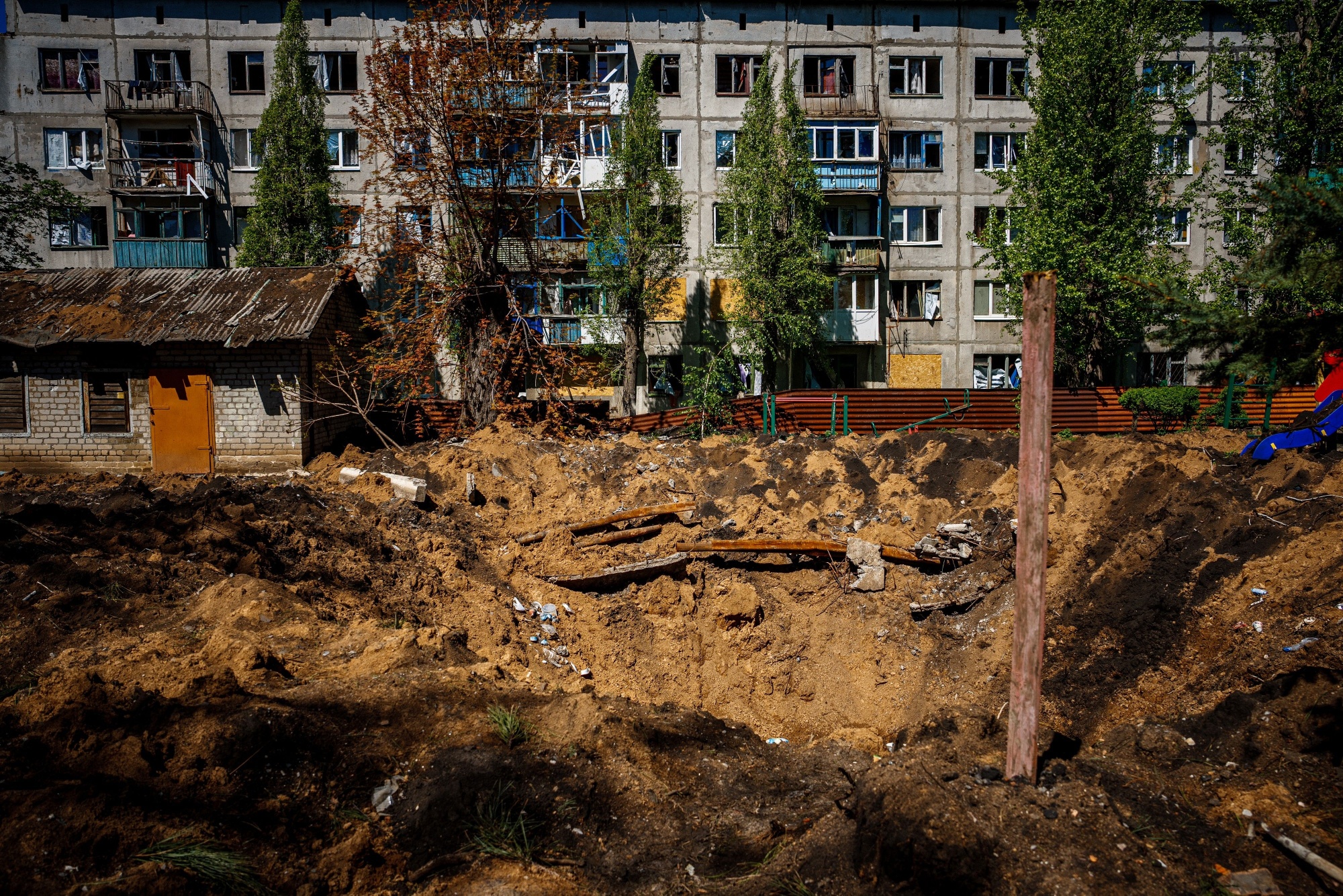 俄罗斯导弹袭击后在乌克兰查西夫亚尔的受损住宅建筑。