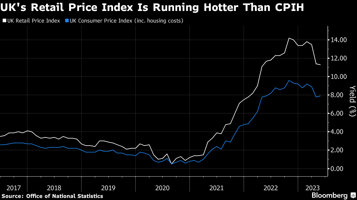 英格兰和威尔士的水务公司截至2022年3月的债务约为606亿英镑(764亿美元),其中超过一半与通货膨胀挂钩,根据英格兰和威尔士的水务监管机构Ofwat的数据。英国的通货膨胀率一直高于大多数其他发达国家。对这些公司雪上加霜的是,绝大多数水务行业的指数链接借款的利率与一项较旧的指标——零售价格指数挂钩,该指数甚至更高——根据彭博社编制的数据,截至五月底为11.3%。