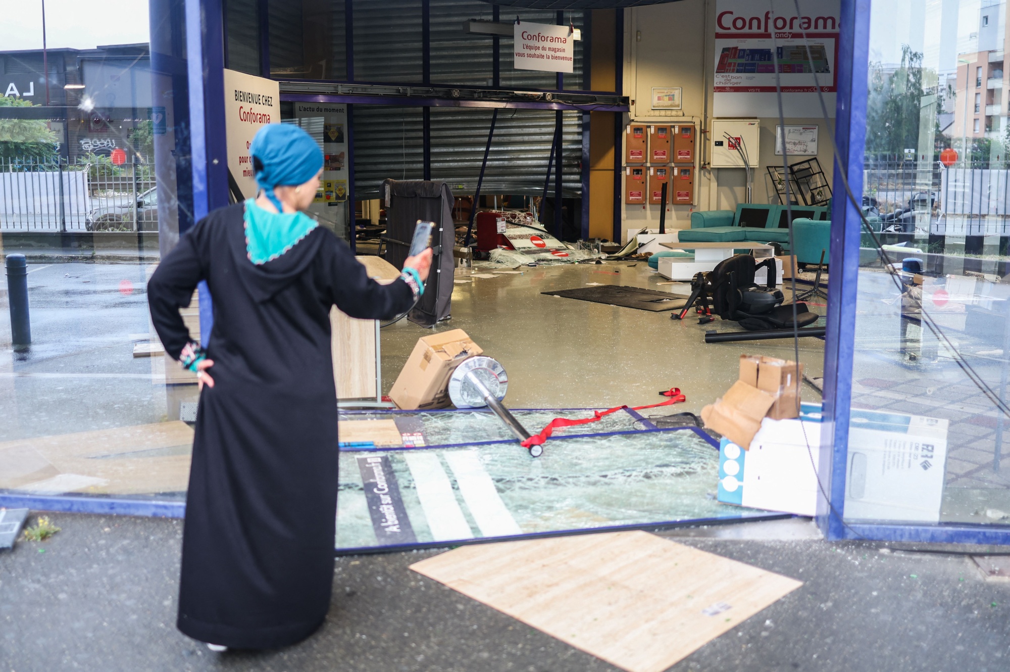 一个女人在7月1日的邦迪(Bondy)一家遭洗劫的Conforama商店入口旁边使用她的智能手机。
