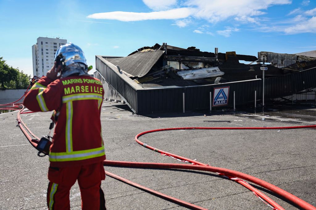 7月1日,马赛北部一家烧毁的阿尔迪商店上的消防员。来源:法新社马克龙已经提前离开布鲁塞尔的欧洲领导人聚会,参加有关危机的会议。熟悉他日程安排的人士表示,由于暴力持续到深夜,他决定周日不前往德国。