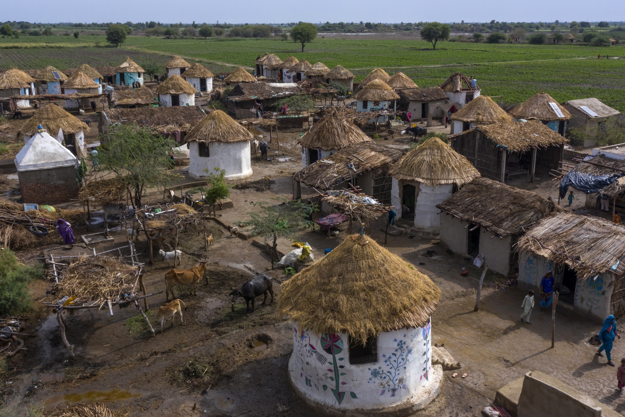 在信德省靠近詹姆苏鲁市的一个村庄里,看到用塑料袋做成的屋顶或者缺少墙壁的房屋并不罕见。那里的五位村民告诉Bloomberg Green他们没有收到任何重建资金,也无法负担修缮费用。