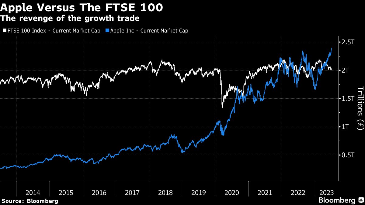 这是图表。苹果在蓝色,市值约为2.4万亿英镑,而富时100指数在白色,市值略超过2万亿英镑。