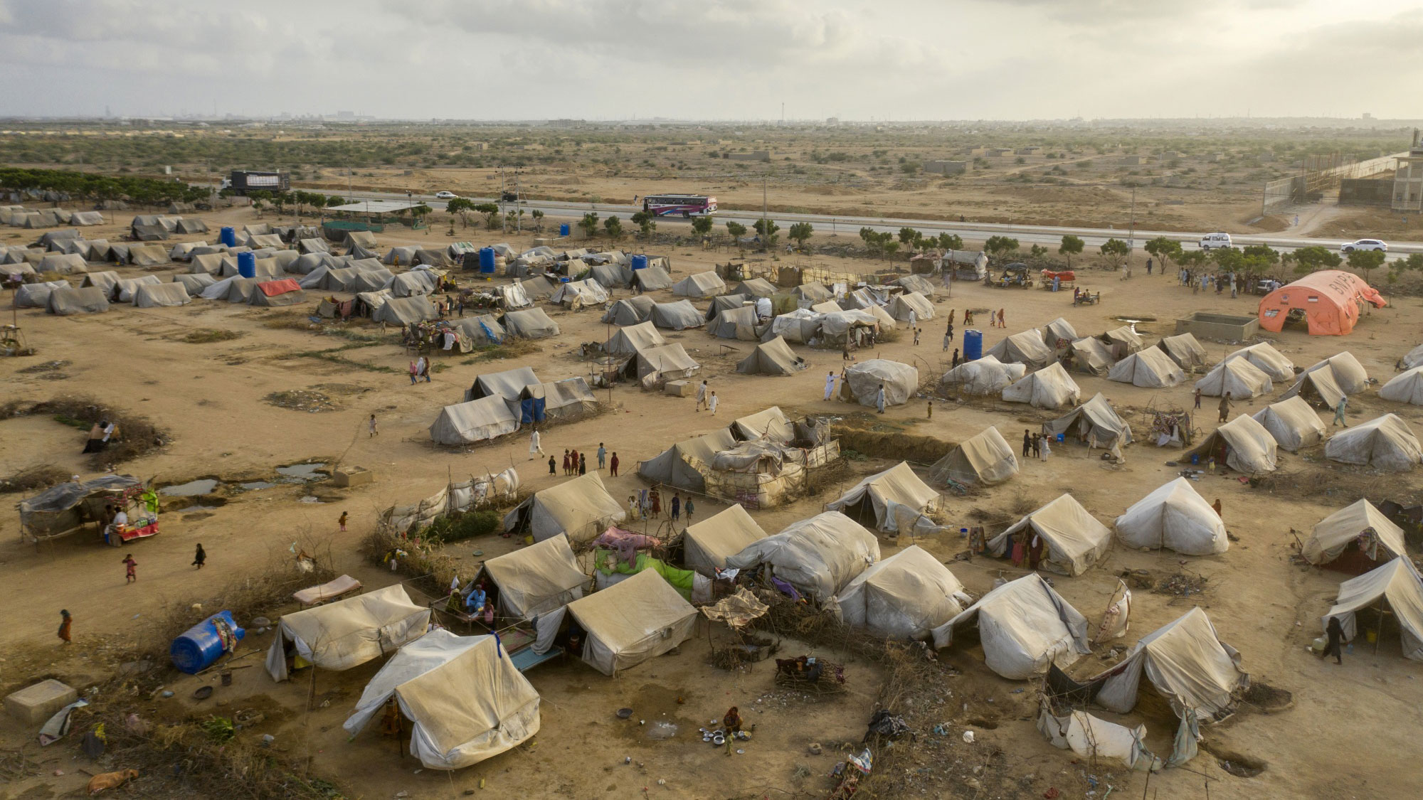 2023年5月,巴基斯坦卡拉奇外的难民营。摄影师:Asim Hafeez/Bloomberg巴基斯坦仍在为10个月前造成1700多人死亡、800万人流离失所并使经济损失超过300亿美元的严重洪灾而苦苦挣扎。救援援助已经大部分枯竭,今年的暴雨和强风已经导致更多的破坏。巴基斯坦现在发现自己陷入了一个恶性循环:气候变化导致更强烈的降雨,进而导致更严重的洪水,这又阻碍了恢复。这是许多其他同样脆弱国家即将面临的命运。