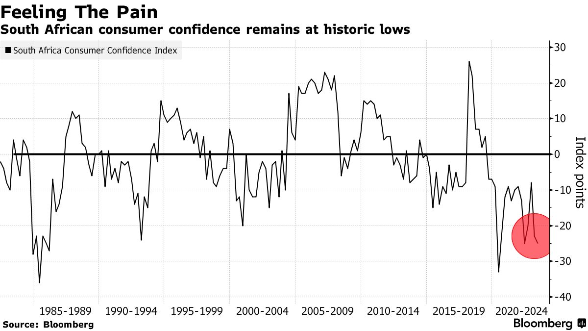 消费者信心在第二季度降至一年来的最低水平,根据第一国民银行和经济研究局的数据。在第一季度,家庭债务超过了收入增长,从上一季度的61.6%上升到62.1%,南非储备银行在其最新季度公报中表示。