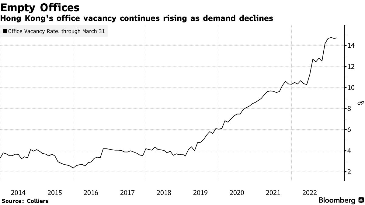 随着银行削减成本、裁员以及一些跨国公司搬离香港,对办公空间的需求急剧下降。根据高力国际集团的数据,香港整体甲级空置率在4月份接近15%,是2019年的三倍多。此外,中环这一著名的金融区已经超过十年来首次出现供应激增。