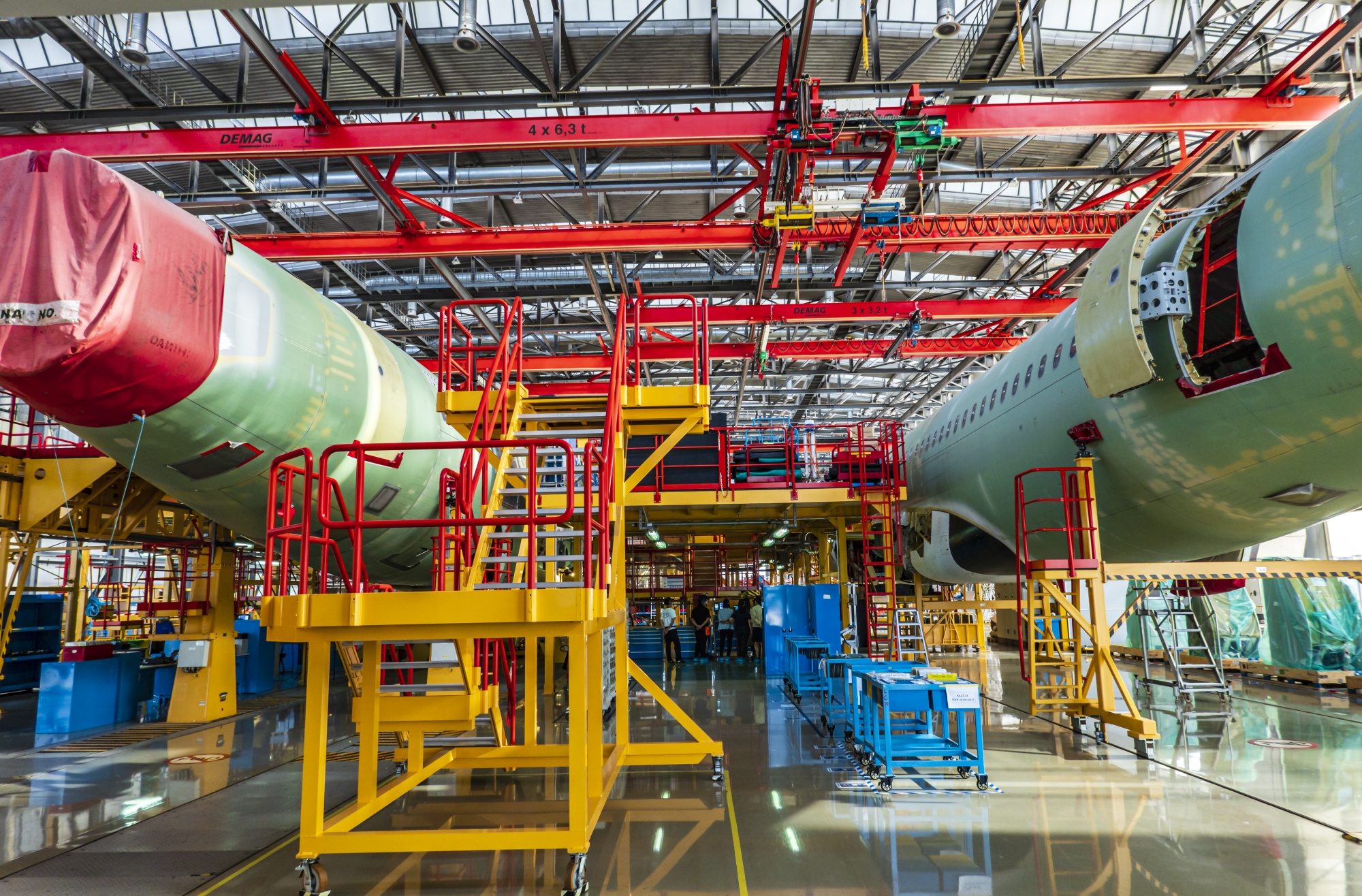 空中客车A320飞机机身在空中客车天津总装厂的最终装配线上。摄影师:VCG/Getty Images空中客车在法国图卢兹总部校园制造其最大的飞机。单通道飞机也在德国汉堡、美国阿拉巴马州莫比尔、蒙特利尔附近的工厂以及位于北京东南约100公里(62英里)的天津制造。天津还是更大的A330和A350型号的完成设施,进行诸如安装内饰之类的工作。