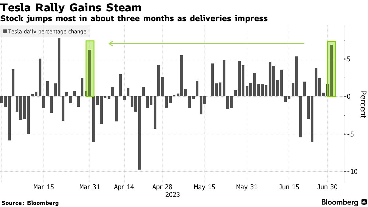 特斯拉公司股价周一上涨了6.9%,创下自3月21日以来的最大涨幅,此后这家全球市值最高的汽车制造商表示在第二季度全球交付了创纪录的466,140辆汽车,超过了华尔街的预期。该公司的股价预计将在周三继续上涨,在盘前交易中略有上涨,因为其中国产量增加了近20%。