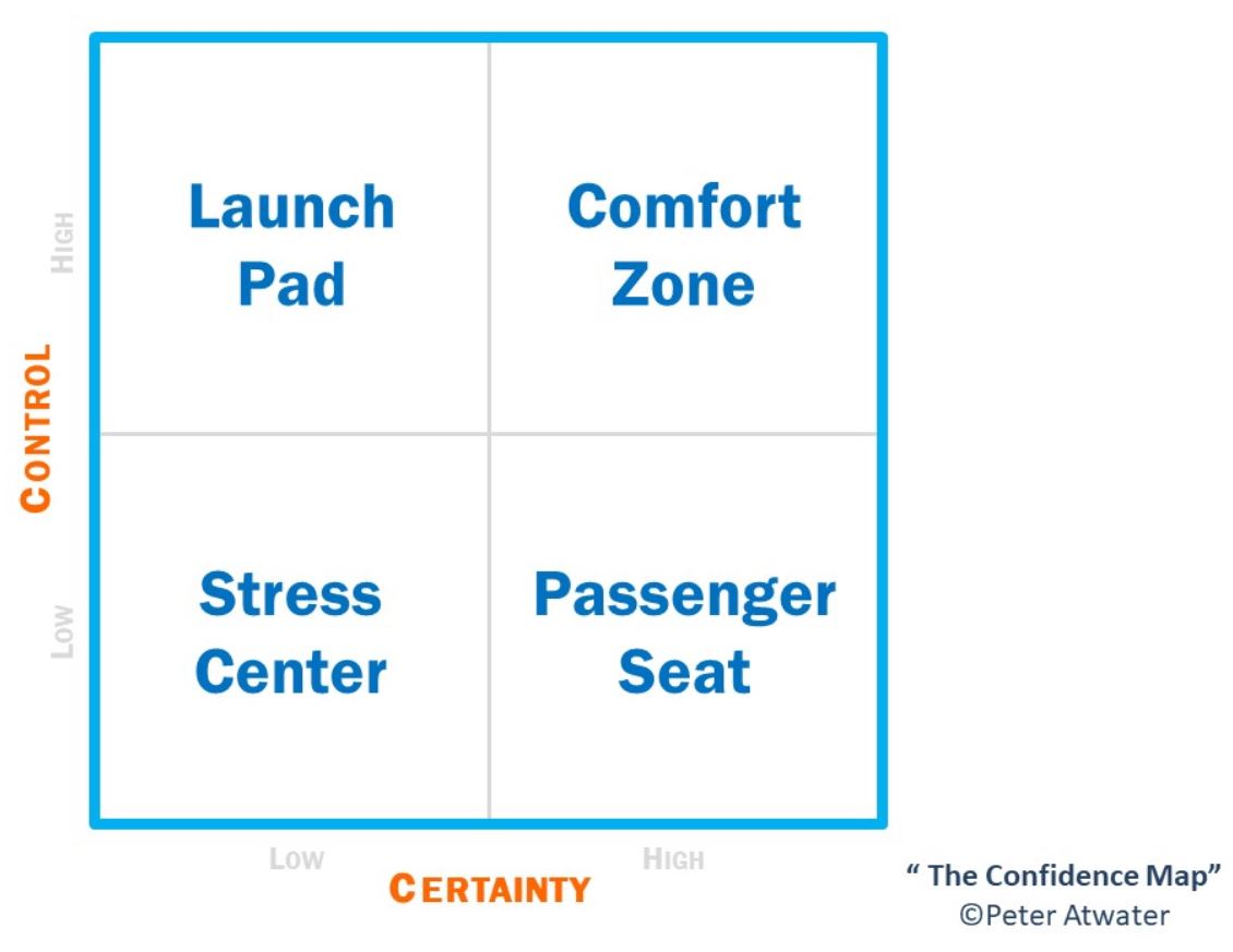 阿特沃特然后专注于通过划分高低控制和确定性水平而创建的四个方框。低水平的两者将使你陷入“压力中心”,高水平的两者将使你进入“舒适区”,低控制但高确定性将使你处于“乘客座位”,而高控制但低确定性将使你进入“发射台”: