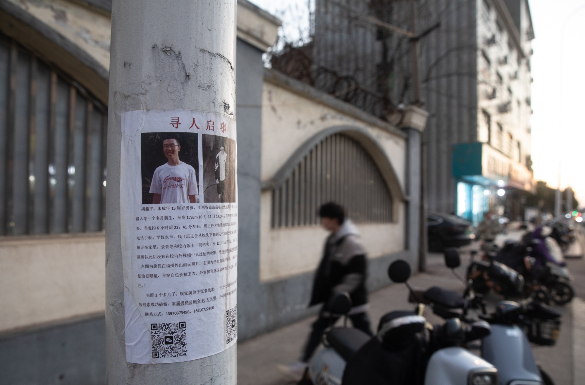 在江西省上饶市,一名名为胡新宇的学生的失踪人员海报于一月份发布。这名15岁男孩显然死于自杀。