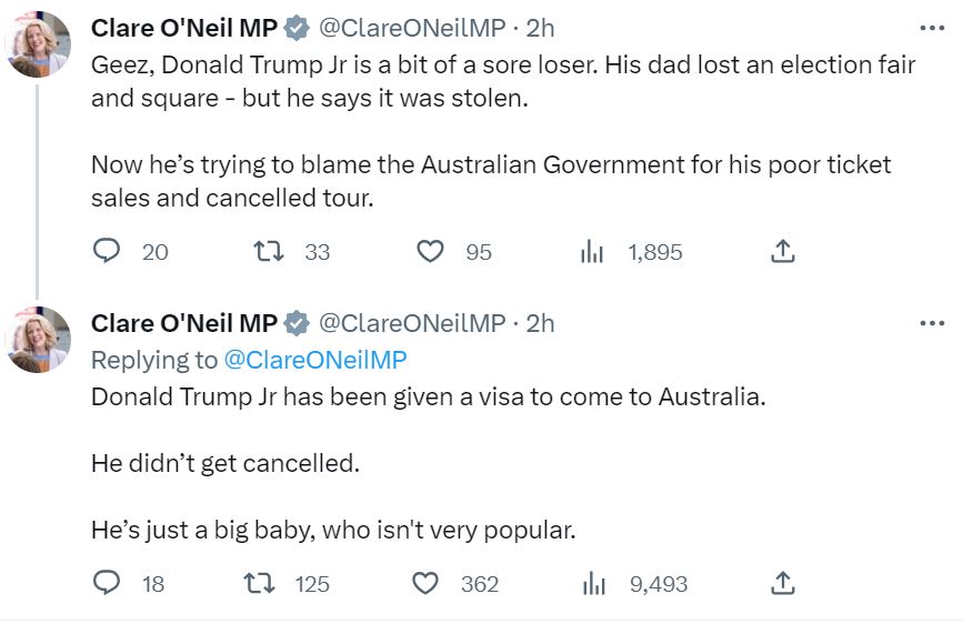 克莱尔·奥尼尔现已删除的推文。来源:Twitter公司澳大利亚内政部长克莱尔·奥尼尔周四在Twitter上表示,特朗普的儿子被发放了签证。在一条后来被删除的推文中,奥尼尔表示特朗普的儿子试图责怪澳大利亚政府“糟糕的门票销售和取消的巡回演出”。