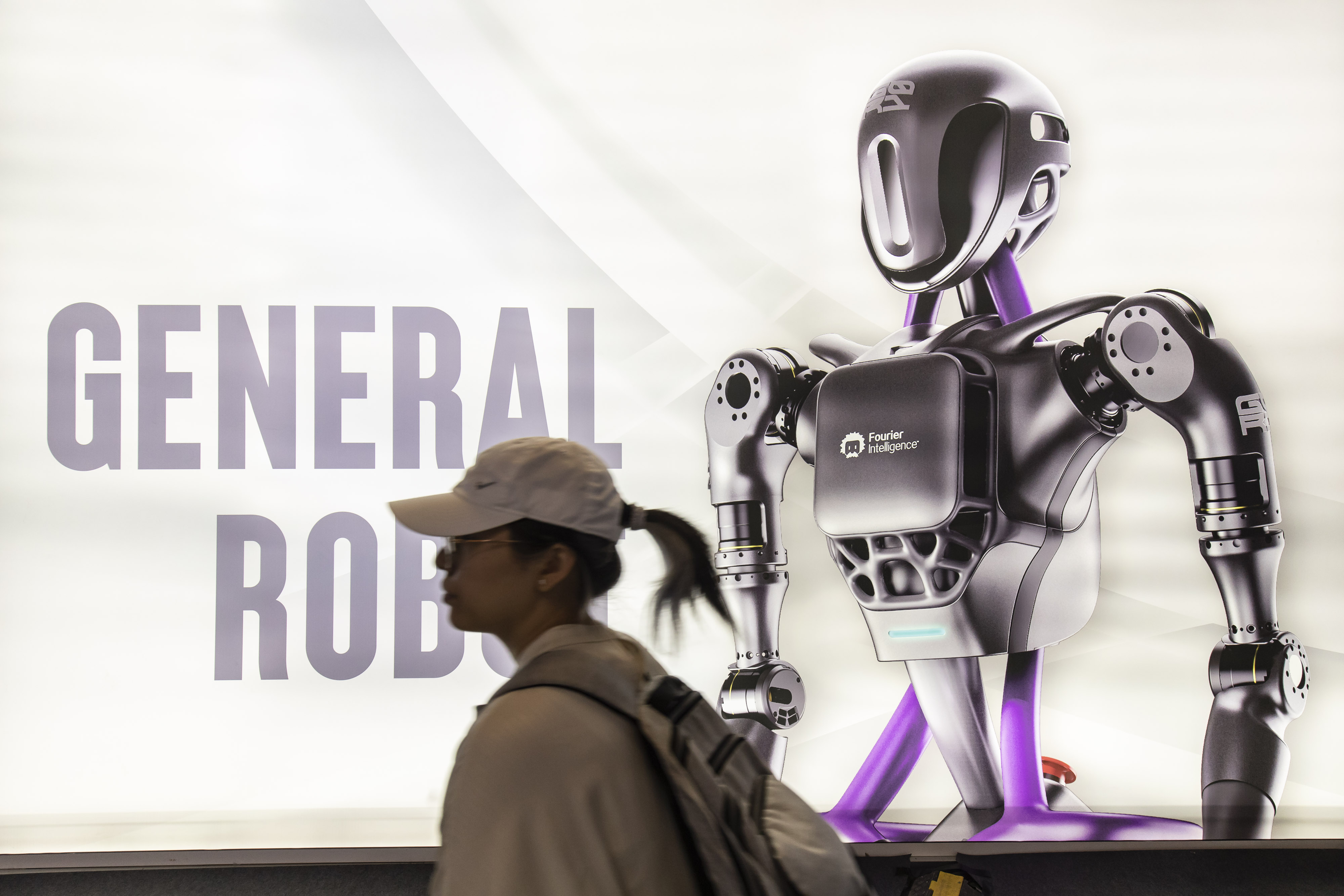 世界人工智能大会的一名参会者周五在上海经过一张通用机器人海报。