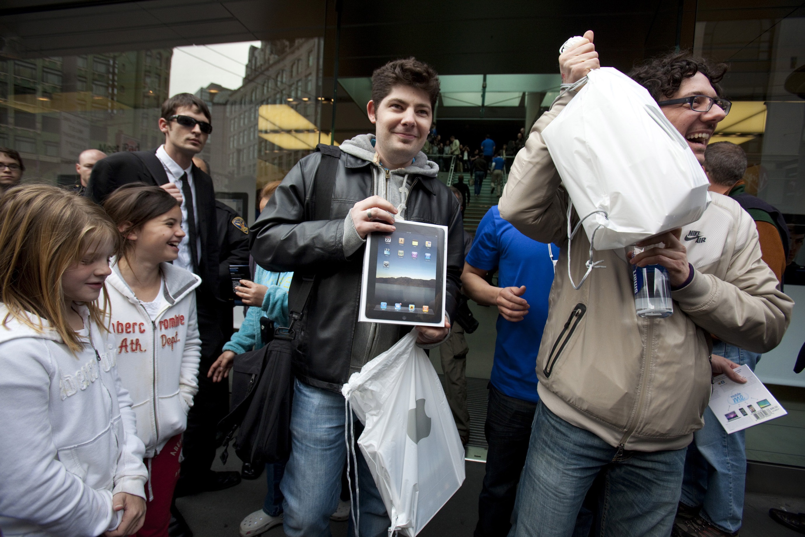 2010年iPad零售发布。摄影师:Kim WhiteApple Watch起步比这些产品慢,但后来成为业务的重要组成部分。苹果从未将Apple Watch的销售额单独列为一类;该设备被纳入了一个名为“可穿戴设备、家庭和配件”的部门,其中还包括AirPods、Beats耳机、HomePod和Apple TV。