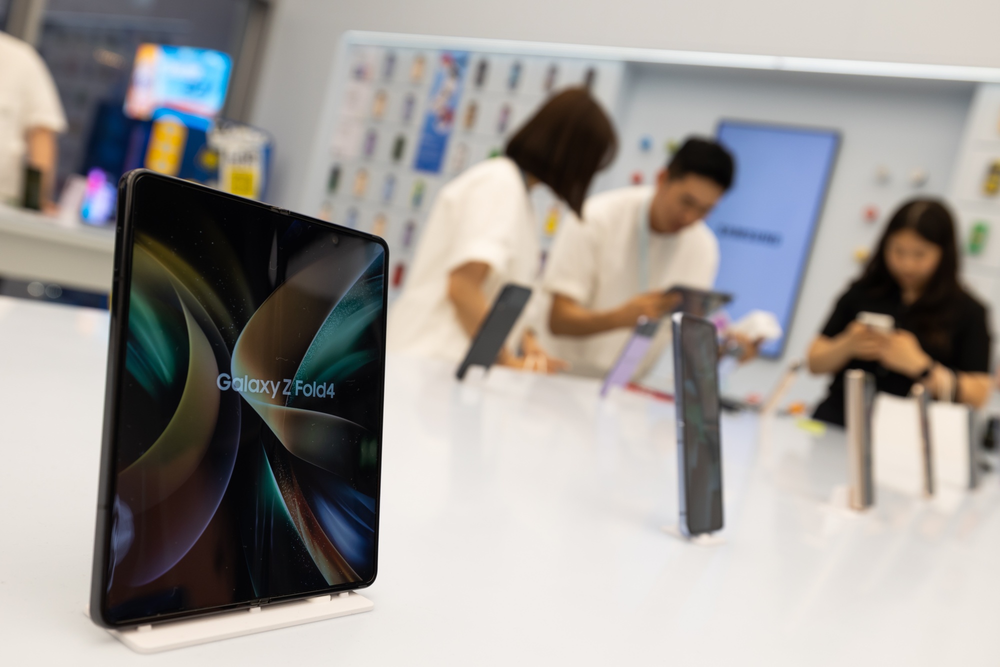 三星Galaxy Fold在公司的新韩国零售店。摄影师:SeongJoon Cho/Bloomberg**三星Unpacked — 东部时间7月26日上午7点:**按照其惯例,三星计划在苹果大型iPhone发布会之前的几周推出最新设备。三星的活动名为Unpacked,可能包括Galaxy Z Fold 5和Z Flip 5,以及一款新平板电脑、多款智能手表,可能还会推出新版本的Galaxy Buds。