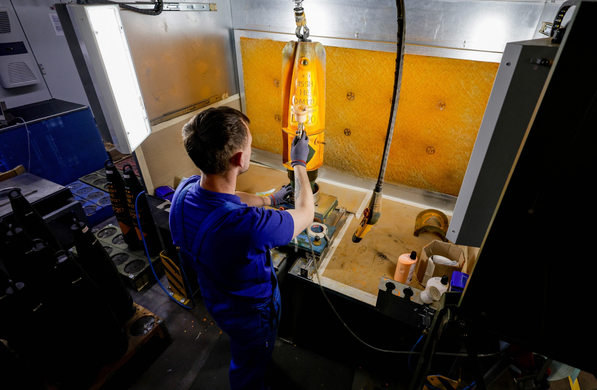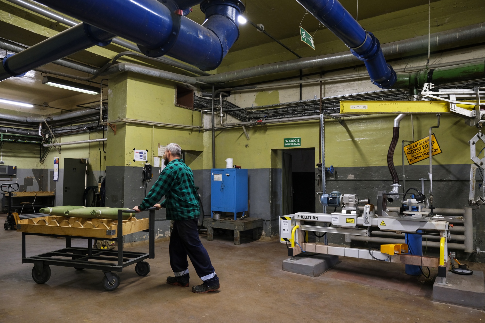 在波兰比得哥什的硝化化学SA弹药工厂生产155毫米破片-碎片弹药弹壳,时间是2023年7月。