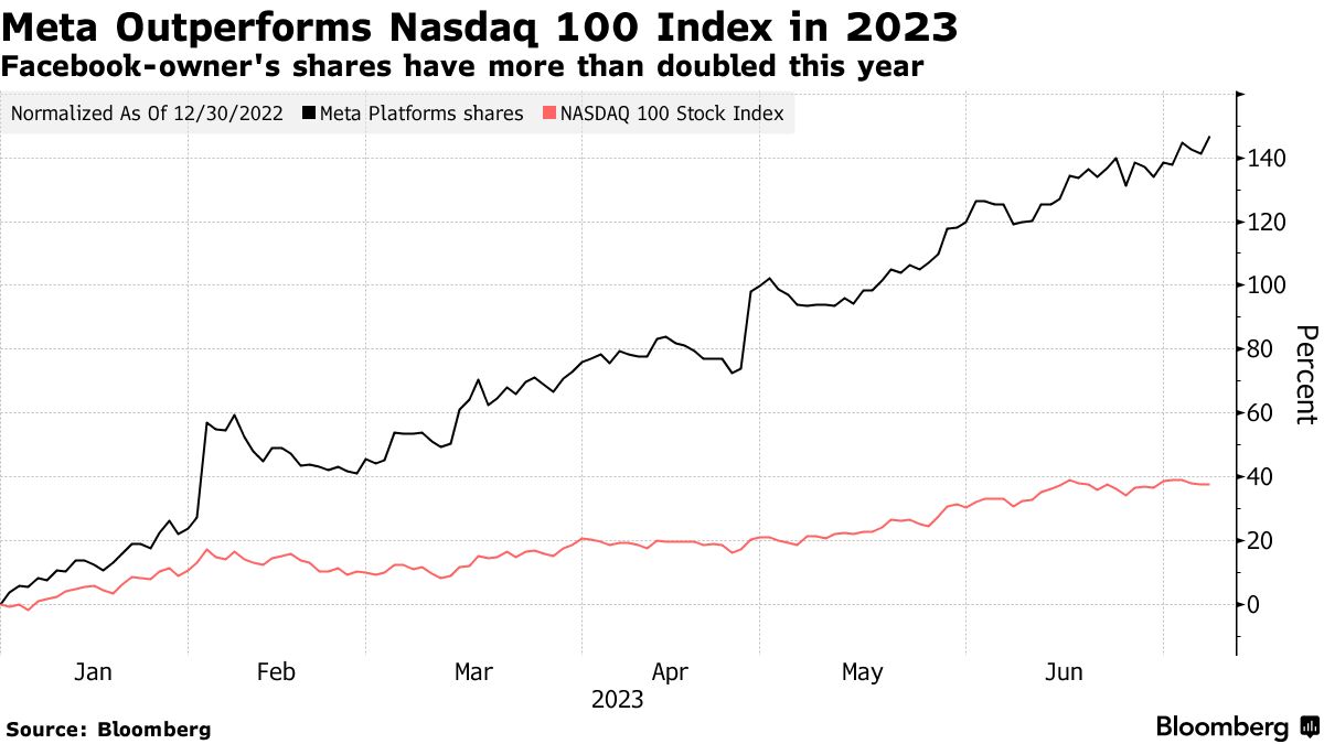 Meta的股价今年已经翻了一番,周一交易中一度飙升2.6%,触及17个月来的新高。Meta与其他科技巨头一起,已成为推动2023年标普500指数和纳斯达克100指数上涨的主要力量之一。