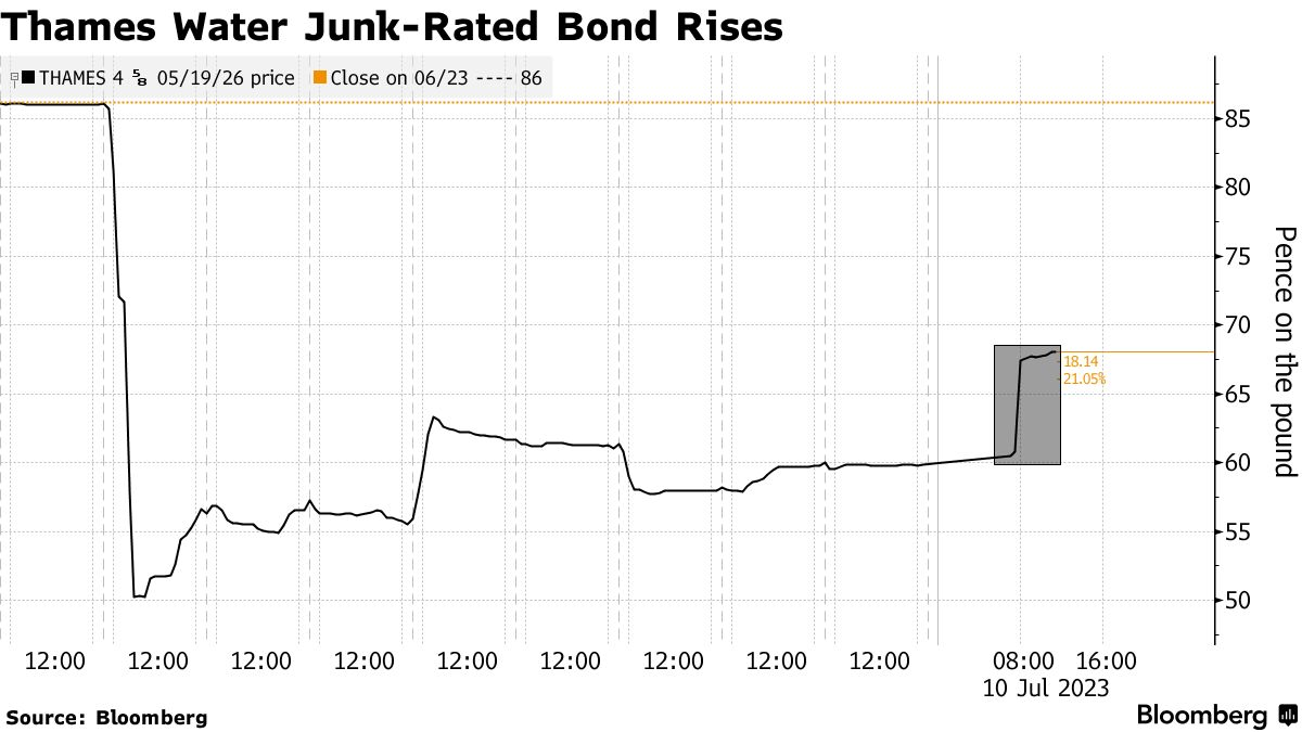 泰晤士水公司控股公司发行的4亿英镑垃圾评级债券在伦敦时间下午3:41时上涨了近9便士,至每英镑68.7便士,但仍远低于两周前的水平。运营公司发行的6.5亿欧元(712百万美元)到2027年到期的债券上涨了1.8欧分,至每欧元94.7欧分。
