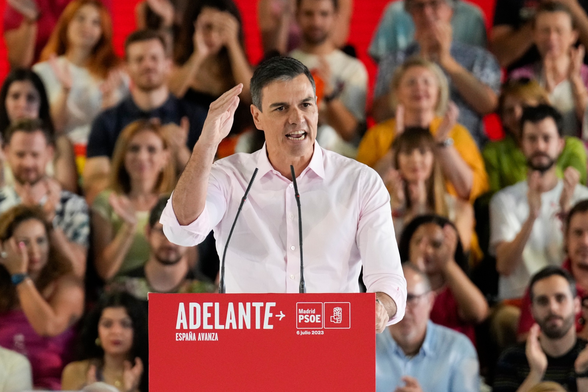 7月7日,马德里,佩德罗·桑切斯在他的第一次竞选集会上。摄影师:保罗·汉纳/彭博社西班牙总理佩德罗·桑切斯在进入唯一一场电视辩论与他的保守派对手之前,所有民意调查都显示他落后,即使在最近几周缩小了差距。