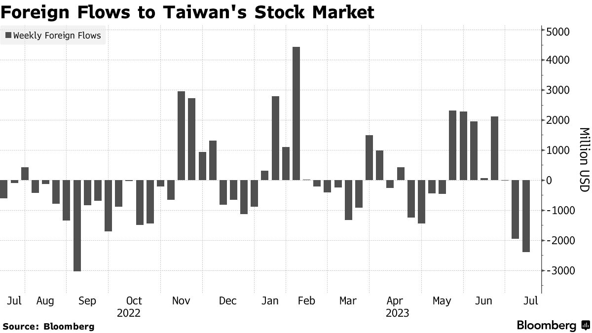 出口连续下降了10个月,由于其技术产品的全球需求疲弱,投资者正在重新评估他们的投资组合。科技公司最近的抛售行为导致台湾股票的净卖出量达到了一年来的最高水平。全球基金在7月8日前两周从台湾股票中撤回了44亿美元。