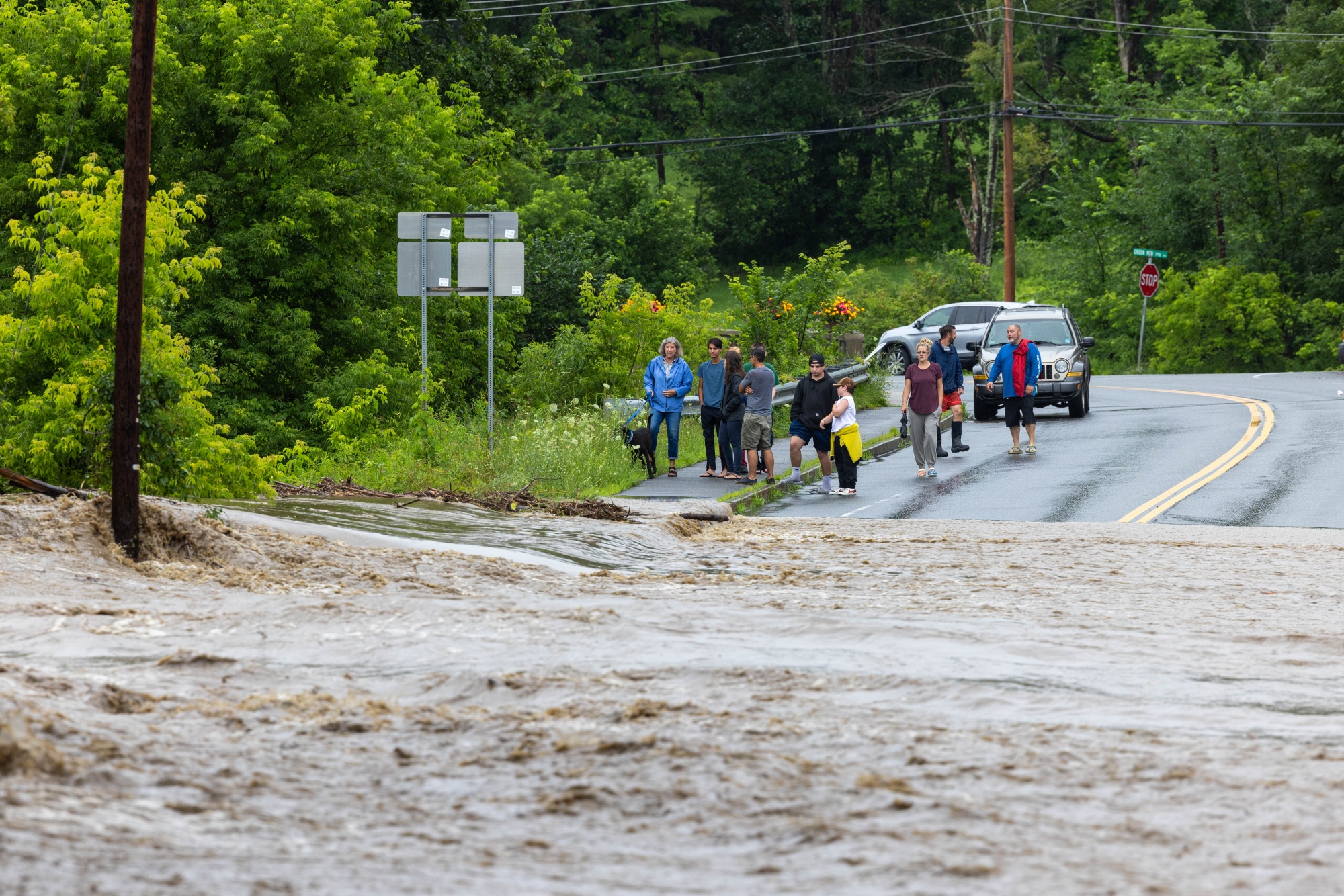 佛蒙特州切斯特一条道路上的洪水流动,7月10日。摄影师:斯科特·艾森/盖蒂图片社这些风暴迫使许多人,特别是佛蒙特州的居民,逃离家园,关闭了纽约和新英格兰地区的道路。根据FlightAware,自周日以来已有超过2700个航班取消,航班跟踪服务。