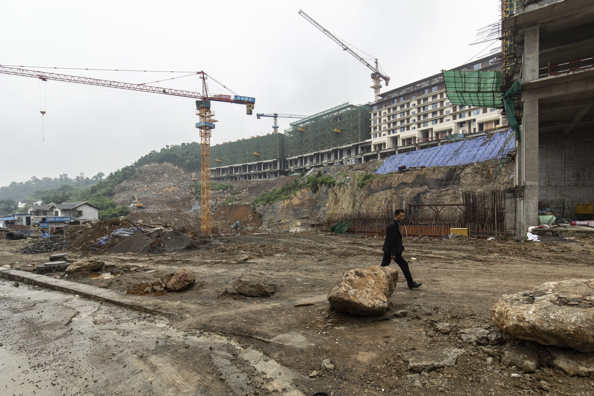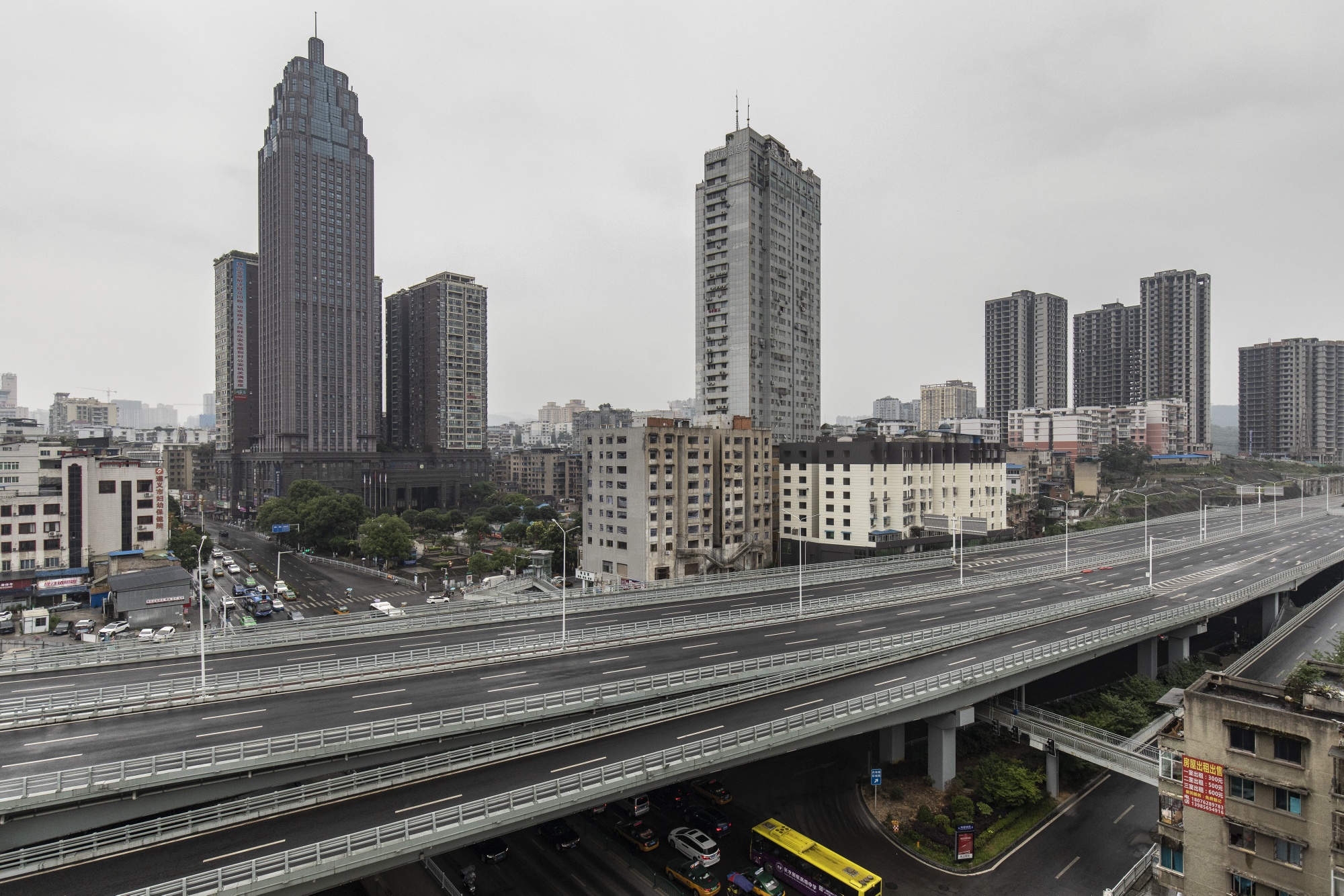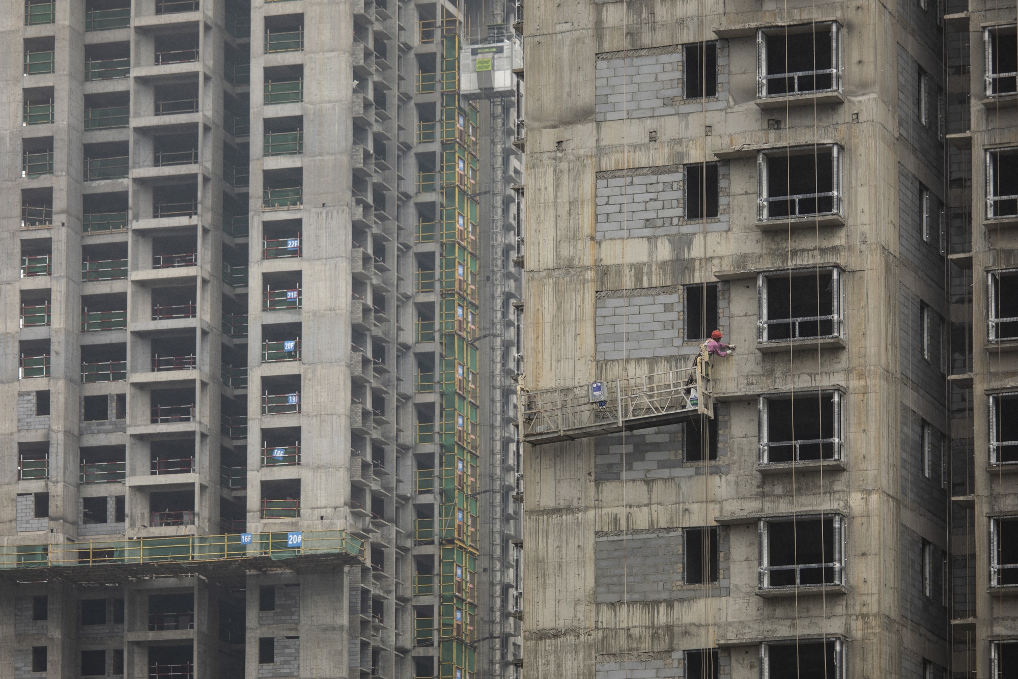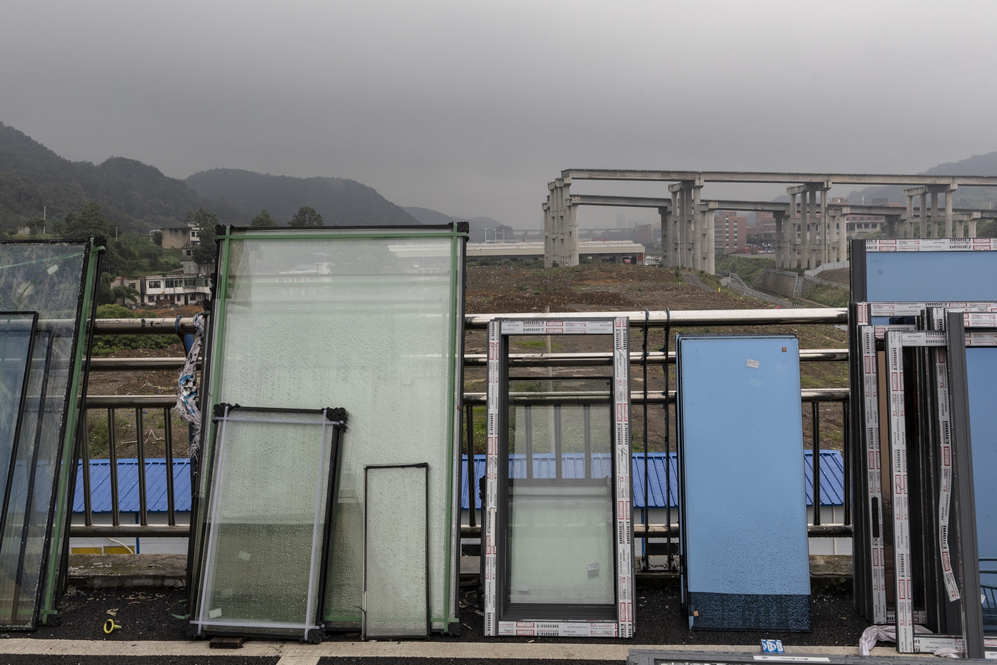 在遵义一家建筑材料市场上,一堆窗框背景是一座停滞不前的高架公路项目。摄影师:沈启赖/Bloomberg俯瞰凤新高速公路旁的两栋几乎没有窗户的公寓楼。一名附近居民姓陈的68岁男子表示,政府曾告知居民搬迁,因为这些建筑将被拆除以便修建新道路。由于资金耗尽,政府正在对这些楼进行粉刷和翻新,希望重新出售,陈说。