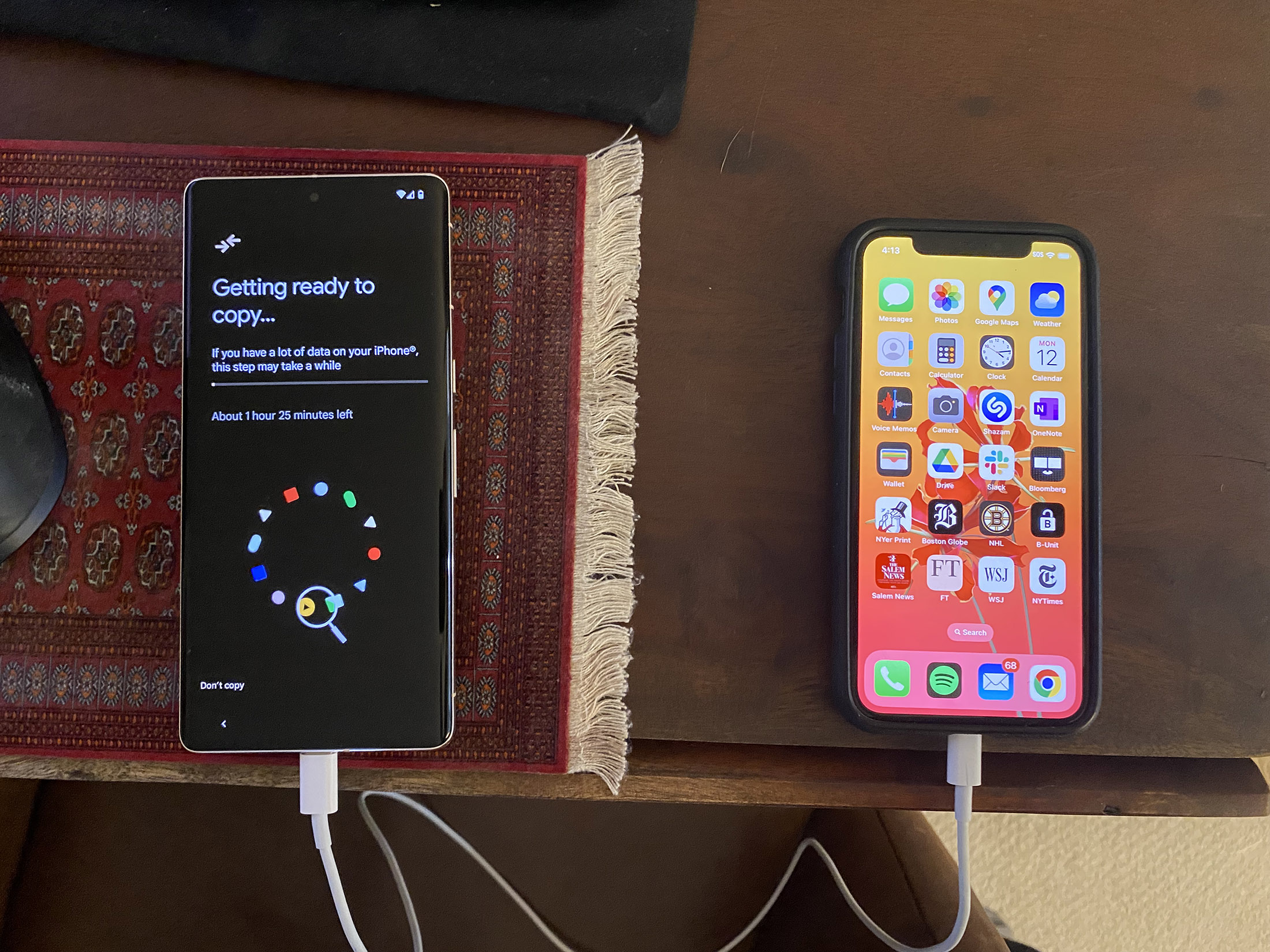 一位谷歌支持代理无法解决问题,将我转介给苹果客户服务部门,通过一个1-800号码。与此同时,在线故障排除者建议我在Pixel恢复出厂设置后重新开始。为了加快这一过程,建议我在线向苹果发出单独请求,直接将我的照片和视频复制到谷歌的云端,以免阻塞有线iPhone到Pixel的过程。这个额外的请求确实加快了第二次尝试的速度,缩短到大约三个小时,因为我只是在移动旧文本和其他较小的项目,但是交接再次失败。这次没有传输iMessages。然而,9:18的闹钟又回来了。