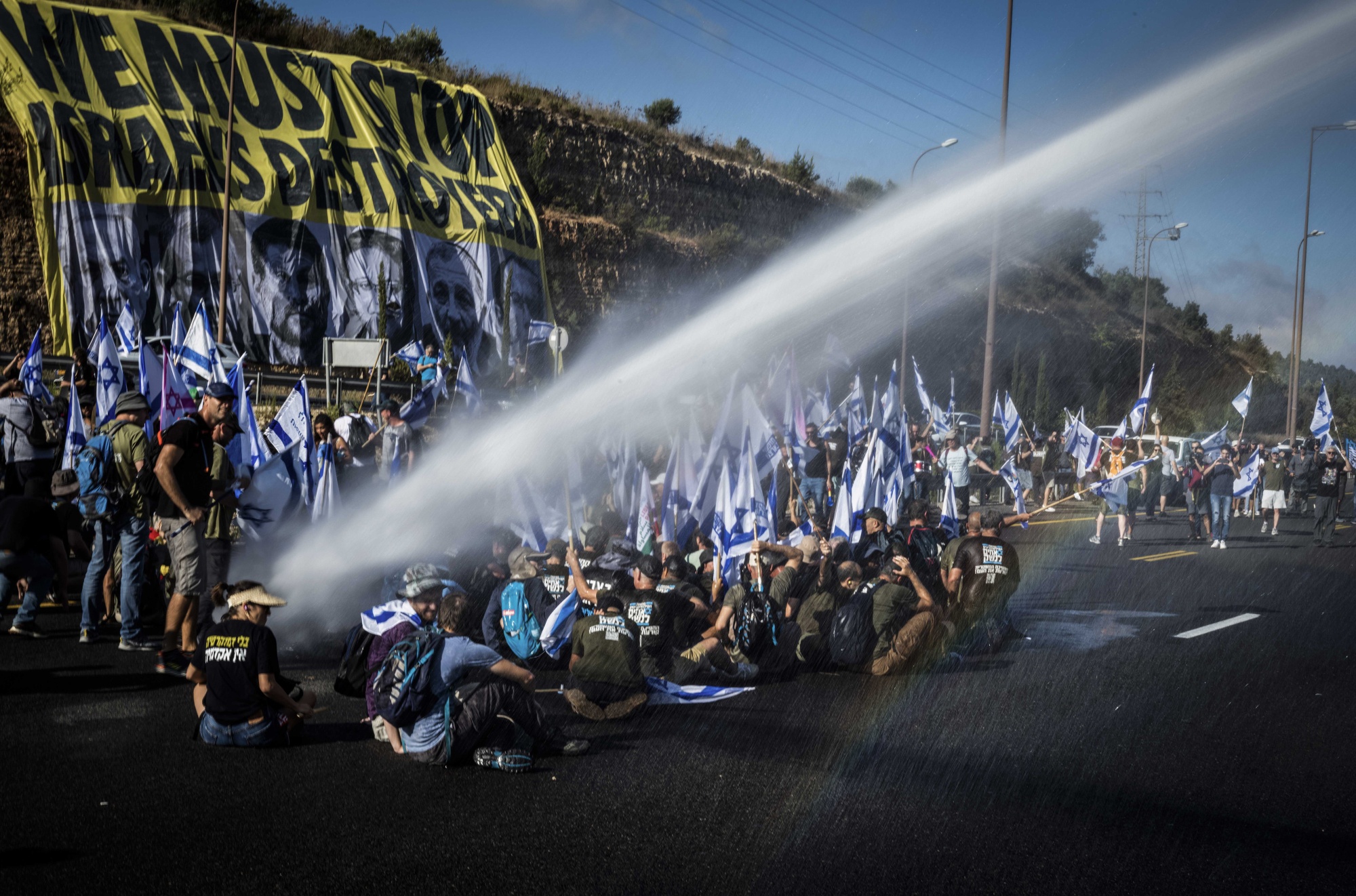 警方向7月11日阻挡通往耶路撒冷的抗议者喷水。摄影师:伊利亚·叶菲莫维奇/图片联盟/盖蒂图片社