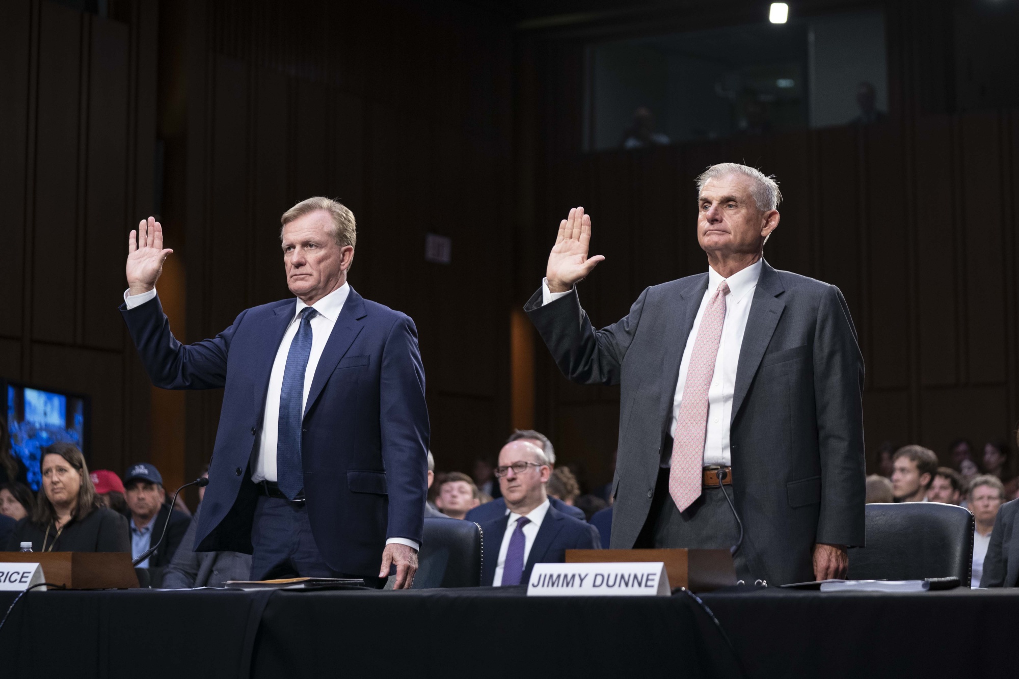 PGA巡回赛首席运营官Ron Price(左)和PGA董事会成员吉米·邓恩在华盛顿参议院国土安全和政府事务小组委员会听证会上宣誓就职,日期为7月11日。摄影师:Sarah Silbiger/Bloomberg立法者要求对PGA巡回赛和LIV高尔夫意外合并展开调查,原因是存在反垄断担忧,指责沙特政府利用对体育的投资转移对人权侵犯的注意力。