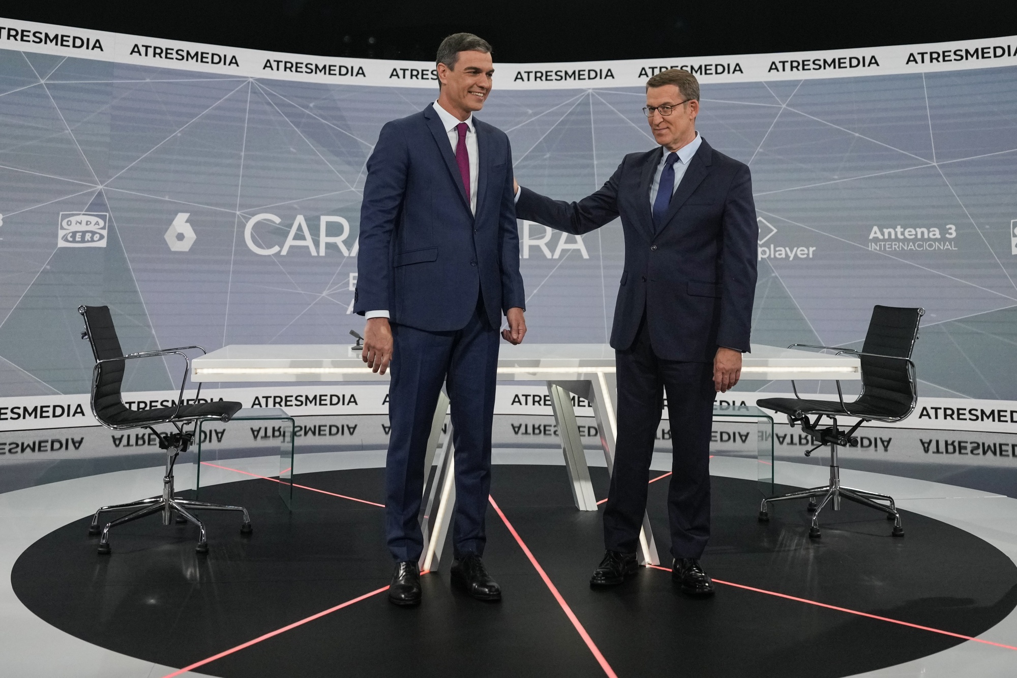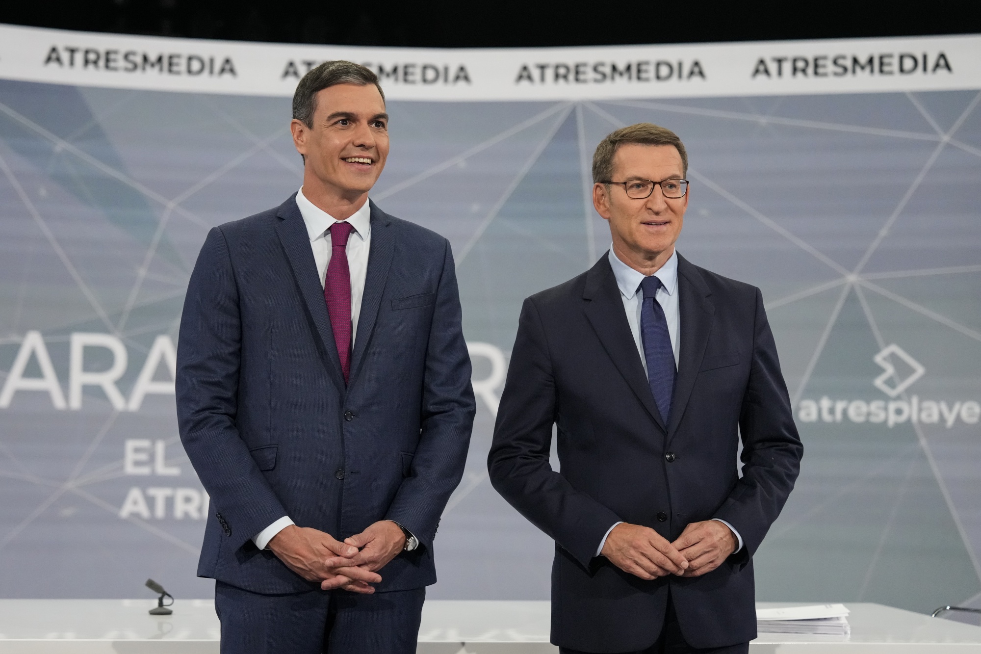 佩德罗·桑切斯(Pedro Sanchez)左,阿尔贝托·努涅斯·费霍(Alberto Nunez Feijoo)在周一马德里电视辩论前。