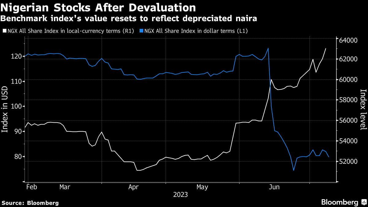 尼日利亚的海外投资流入在过去一个月大幅增加,这是在博拉·蒂努布总统政府允许奈拉贬值40%之后。尽管贬值最初使基准指数的外币价格下调,但由于资金流入推动的股市涨幅已经缓解了这一影响,导致过去两周股市反弹了7.5%。