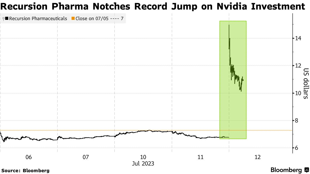 投资者对所有与人工智能相关的事物需求不减的最新迹象:药物发现公司Recursion Pharmaceuticals Inc.的股价创下历史新高,这是由于收到了来自Nvidia Corp.的投资。这家与人工智能相关的芯片制造商投资了5,000万美元,引发了Recursion的股价飙升,该公司利用机器学习来发现新药。股价在周三开盘时翻了一番,最终以创纪录的78%涨幅收盘。
