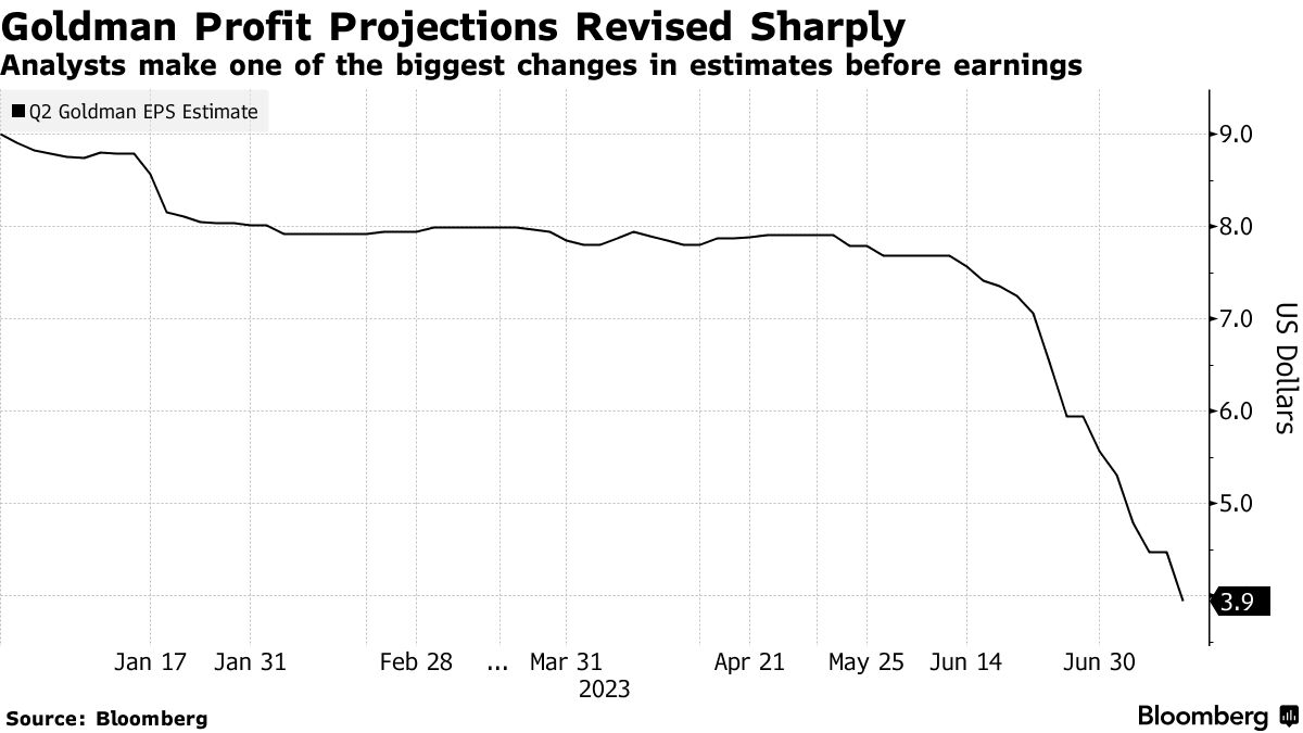 分析师预计第二季度净收入为14亿美元,比去年同期下降了一半以上。这与他们预计的摩根士丹利下降19%以及美国银行和摩根大通的增长相比。高盛的每股收益平均估计仅为3.94美元,一些最近的预测甚至低于3美元。