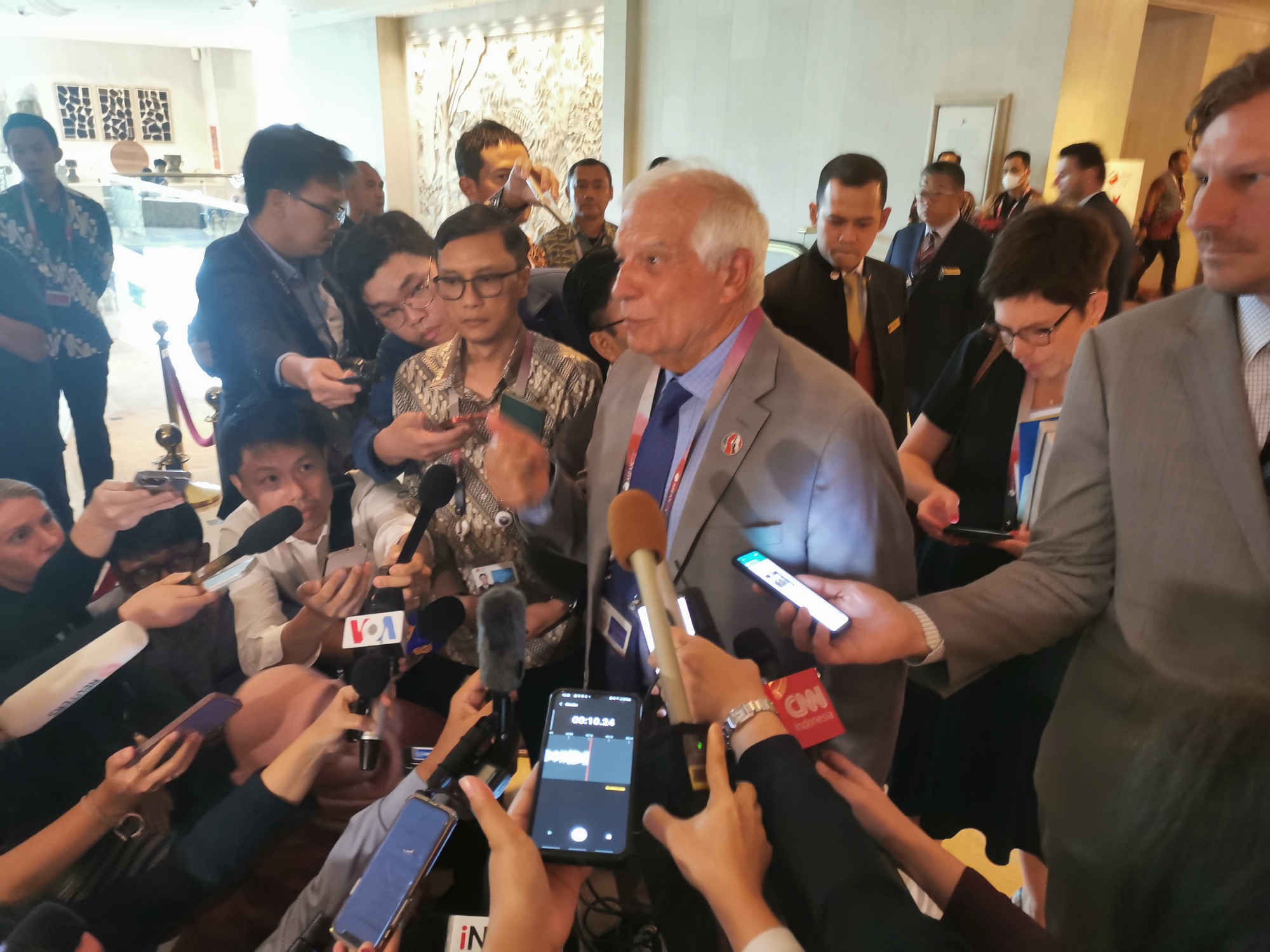 约瑟普·博雷尔于7月13日在雅加达东盟外长会议间与记者交谈。摄影师:Philip Heijmans/Bloomberg### 东盟要求中国“开放和包容”(下午12:03)