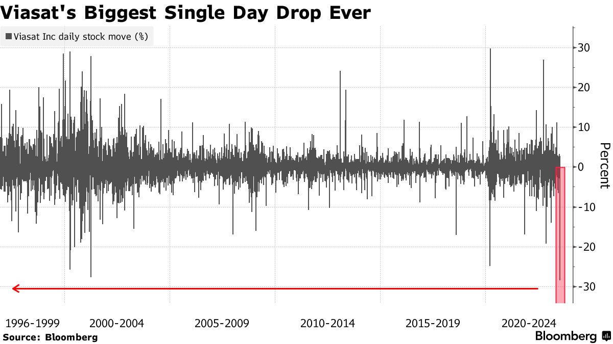 Viasat 公司周四暴跌创纪录的28%,原因是宣布了一项意外事件,威胁到一颗关键通信卫星的性能。