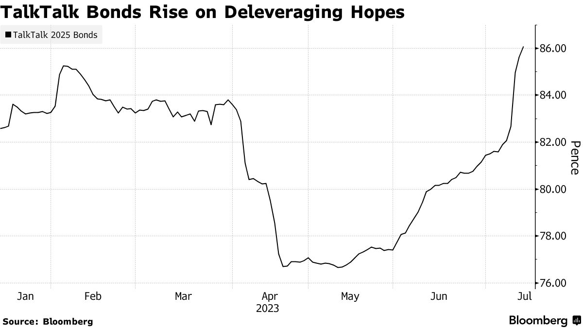 总部位于英国的TalkTalk在2025年2月到期的债务价值6.85亿英镑(8.95亿美元)。今年4月,这些债券跌破了每英镑80便士的关口,许多投资者认为这是财务困境的信号,因为债券持有人担心再融资问题。根据彭博社编制的CBBT数据,自7月11日的财报电话会议以来,这些债券已上涨了超过3便士,达到了大约85便士。