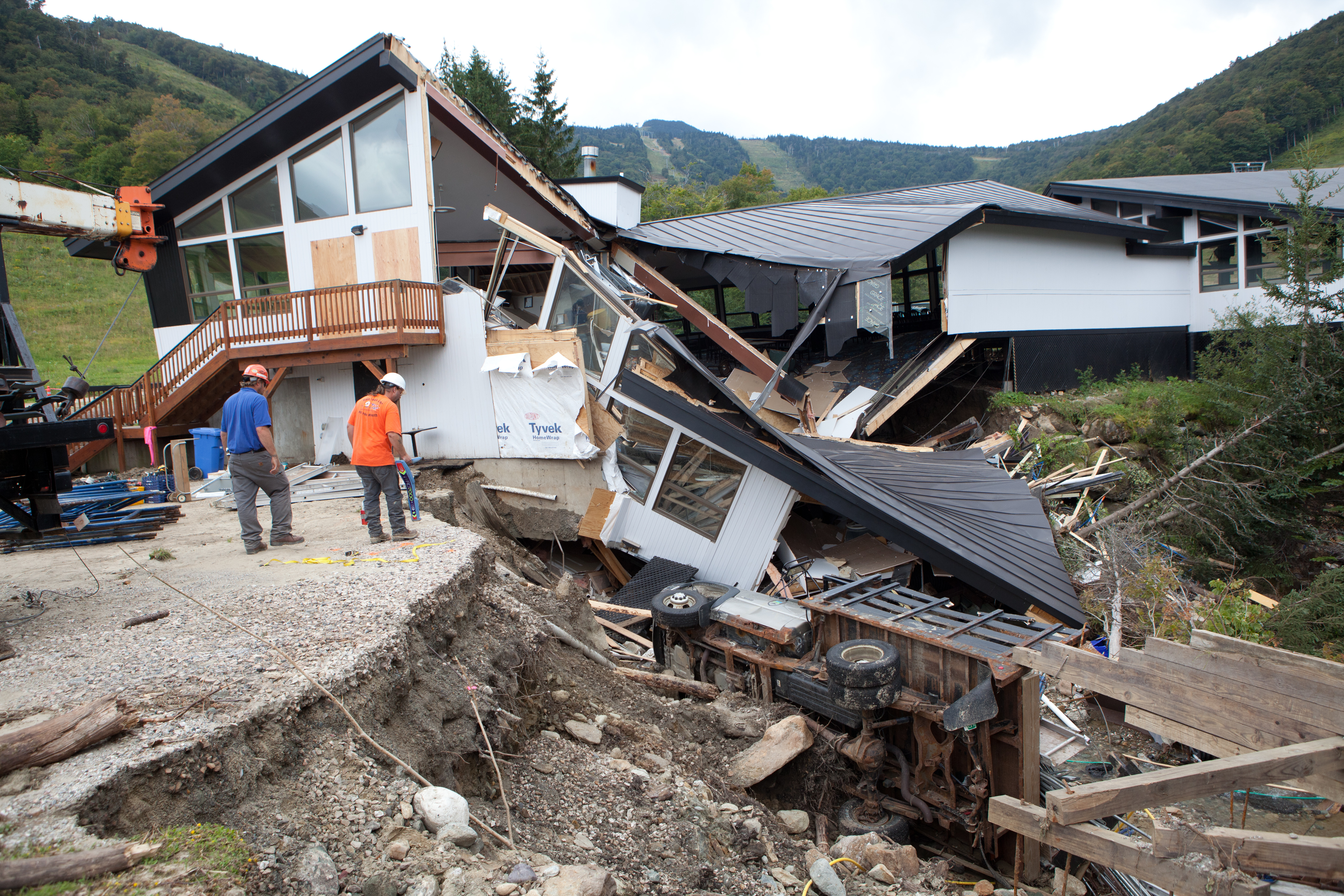 工人们在伊琳飓风过后的佛蒙特州基灵顿查看受洪水破坏的小屋。摄影师:斯科特·艾森/彭博社然而,尽管自伊琳飓风以来的十年间佛蒙特州取得了显著进展,但这些努力与未来面临的挑战相比微不足道。奥茨表示,大约75%的州内河流仍然与其历史洪水平原脱节;当发生极端降雨时,这些河流更有可能试图溢出,回到它们最初的洪水平原。盖格估计大约还有1万栋房屋需要被收购。