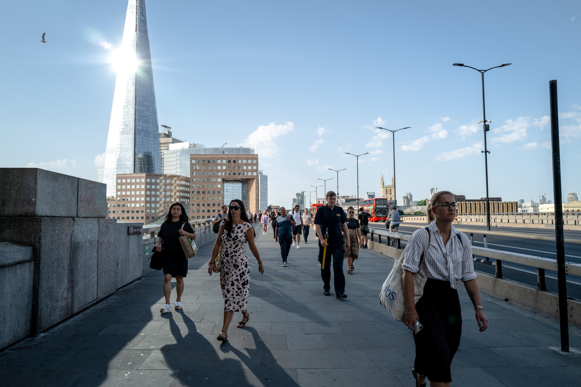 城市工人在伦敦的一个炎热早晨穿过伦敦桥,日期为2022年7月18日星期一。