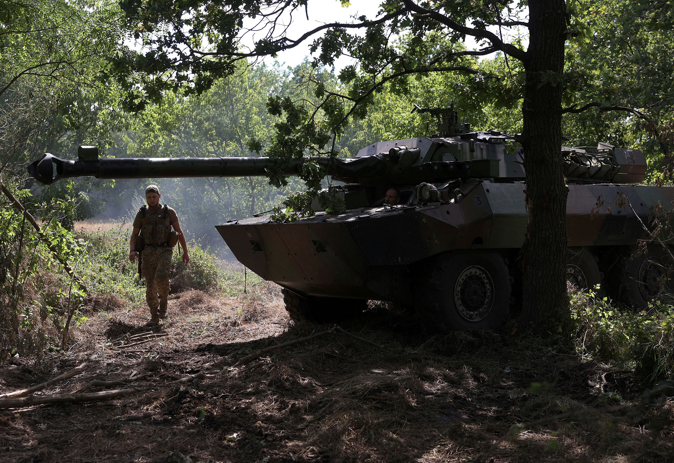 乌克兰海军陆战队员于7月10日在顿涅茨克地区的一个阵地检查一辆装甲战斗车。