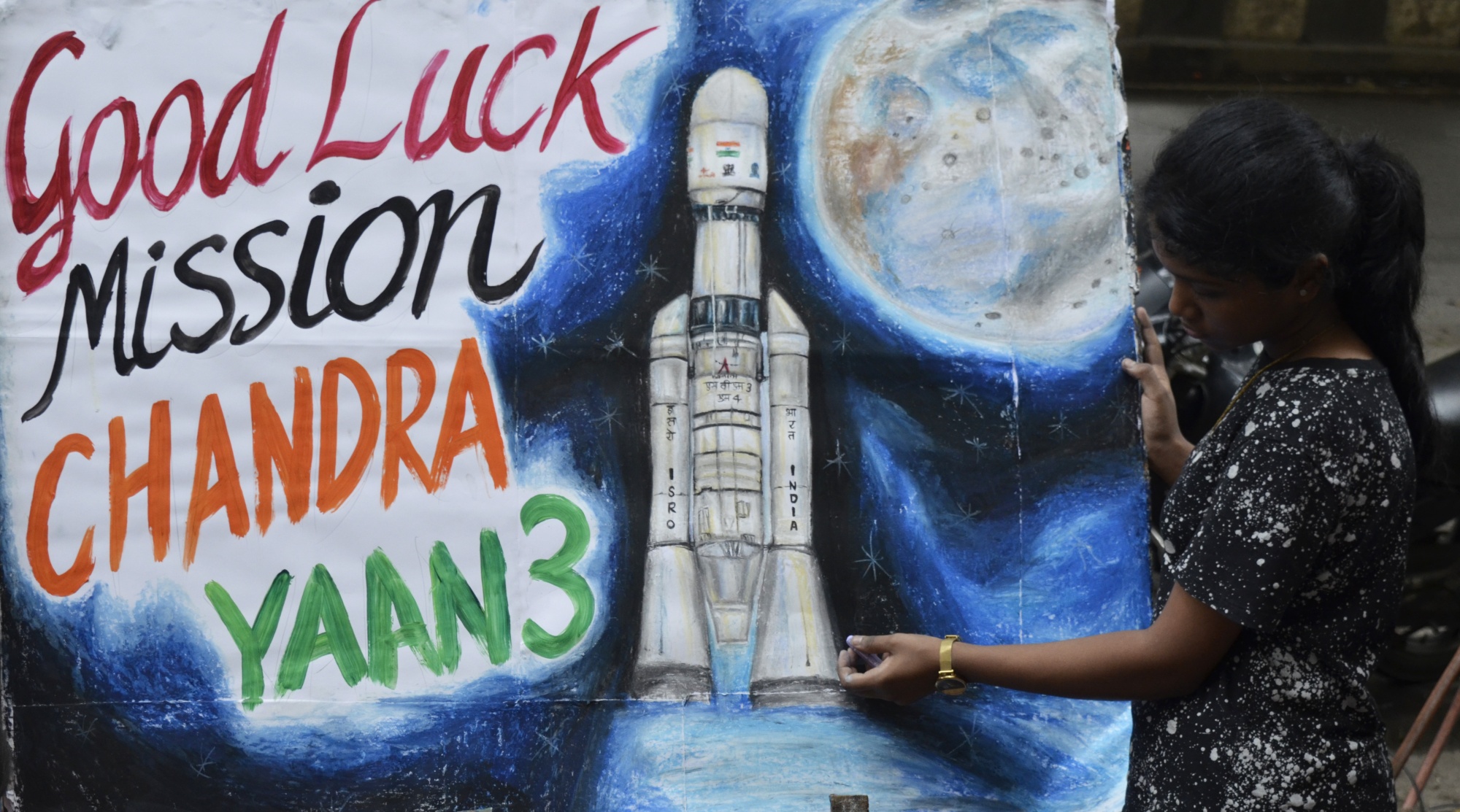 7月13日在孟买为即将到来的“月船3号”任务绘制的一幅画。摄影师:Indranil Aditya/NurPhoto/Getty Images印度发射了一项无人驾驶的登月任务,加入美国、中国和其他国家的新月球竞赛。