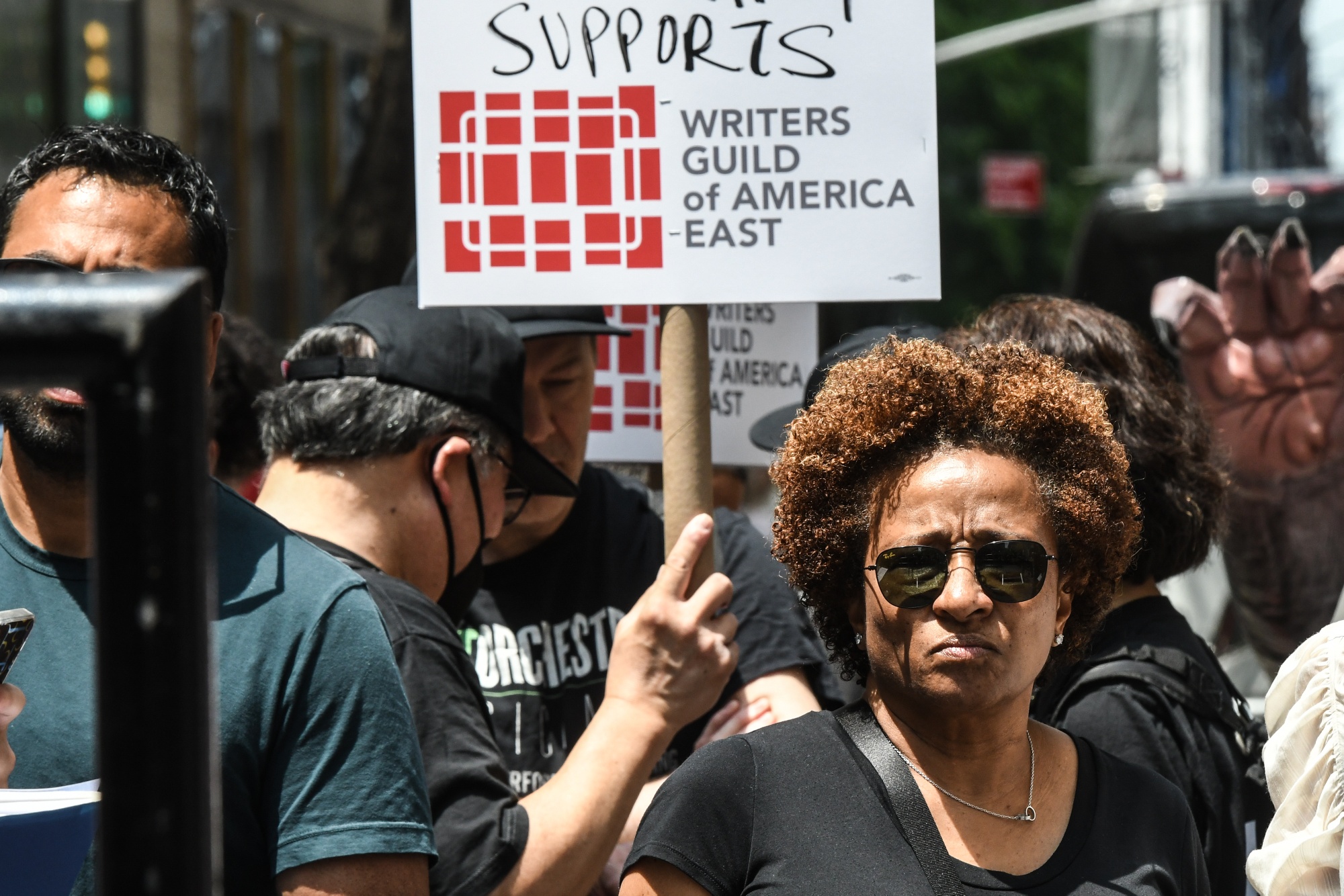 演员旺达·赛克斯(Wanda Sykes)右边,与美国纽约NBC环球总部派遣线外的美国编剧协会成员和支持者,时间是2023年5月23日星期二。自5月2日以来,好莱坞编剧因要求更高的薪水而罢工,他们通过尝试使他们的罢工队伍像他们的节目一样有趣,保持士气并向制片压力。摄影师:斯蒂芬妮·基思/彭博社星期四早上,数十名编剧聚集在华纳兄弟探索公司纽约办公室外,随着我们无法停止的旋律前进。在对抗好莱坞制片厂两个月后,编剧们渴望欢迎16万名演员加入抵抗者的行列(和失业者)。