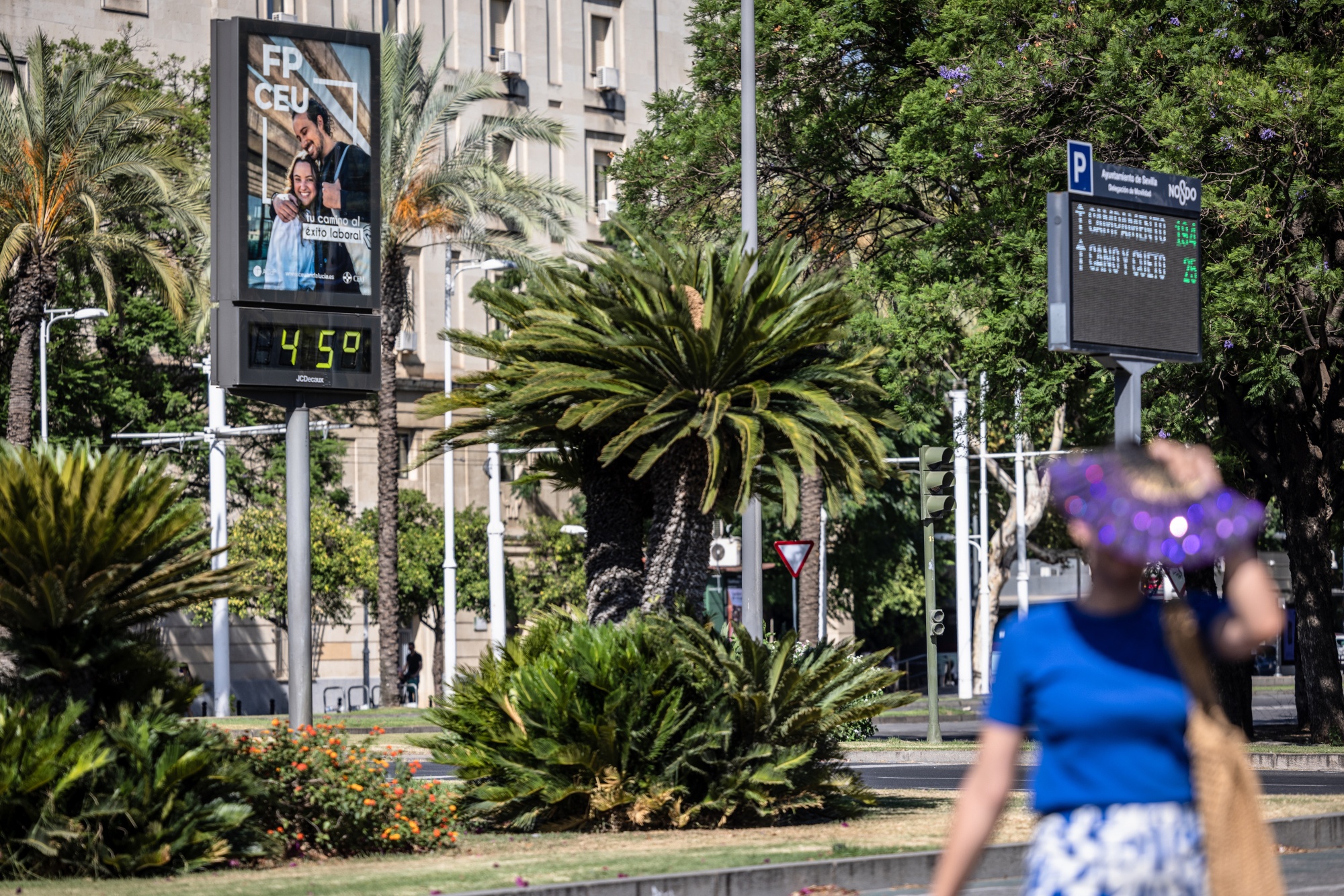 7月10日,人们经过塞维利亚的一个显示温度的指示器,显示45摄氏度。摄影师:Angel Garcia/彭博社阅读更多:热浪导致法国削减核能产量并实施用水限制