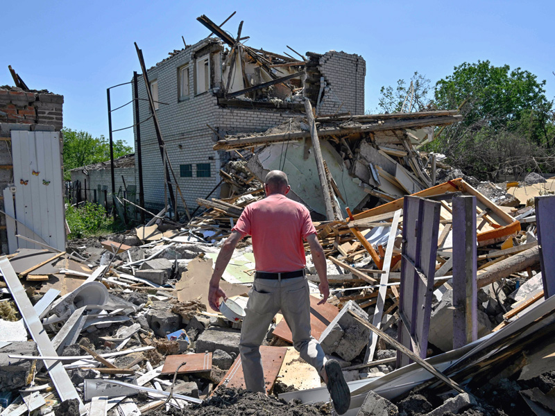 俄罗斯导弹袭击后摧毁的建筑残骸,位于乌克兰顿涅茨克地区的克拉马托尔斯克。