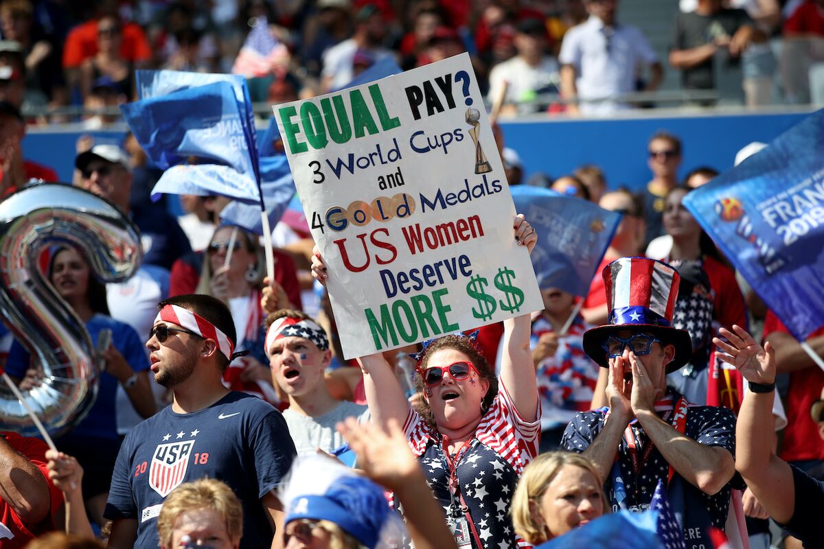 一名球迷在2019年7月7日的里昂举行的2019年FIFA女足世界杯比赛中举着一面抗议美国女足薪酬差距的横幅。摄影师:Marc Atkins/Getty Images Europe2023年女足世界杯是有史以来最受期待的女子体育赛事。但在一些世界最大市场中,它也面临着难以达成有利可图的广播协议的困境——这表明,即使在薪酬方面取得了巨大进步,该运动在增加球员奖励方面仍然面临障碍。
